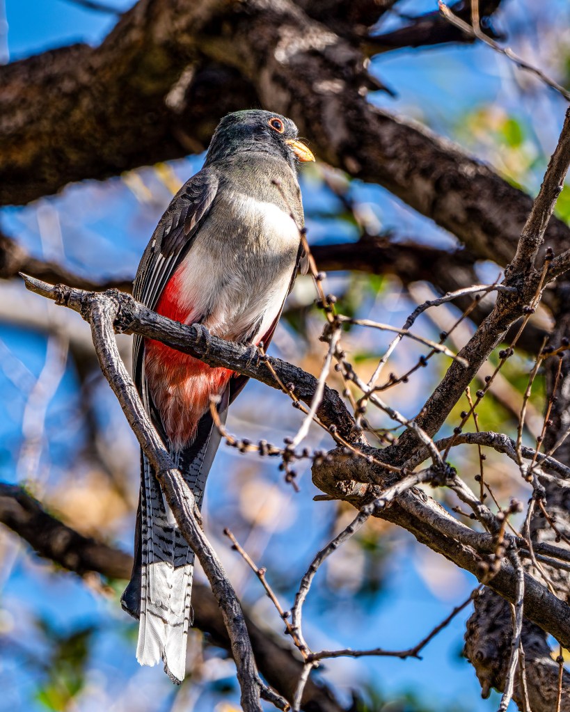 Hoping the Elegant Trogan would make another appearance in the Pyracantha Shrub, we waited patiently. Sure enough, at or near 2:50 PM, the same time as the day before, the young male made an appearance, and offered a close, open pose. I’m a happy camper now.