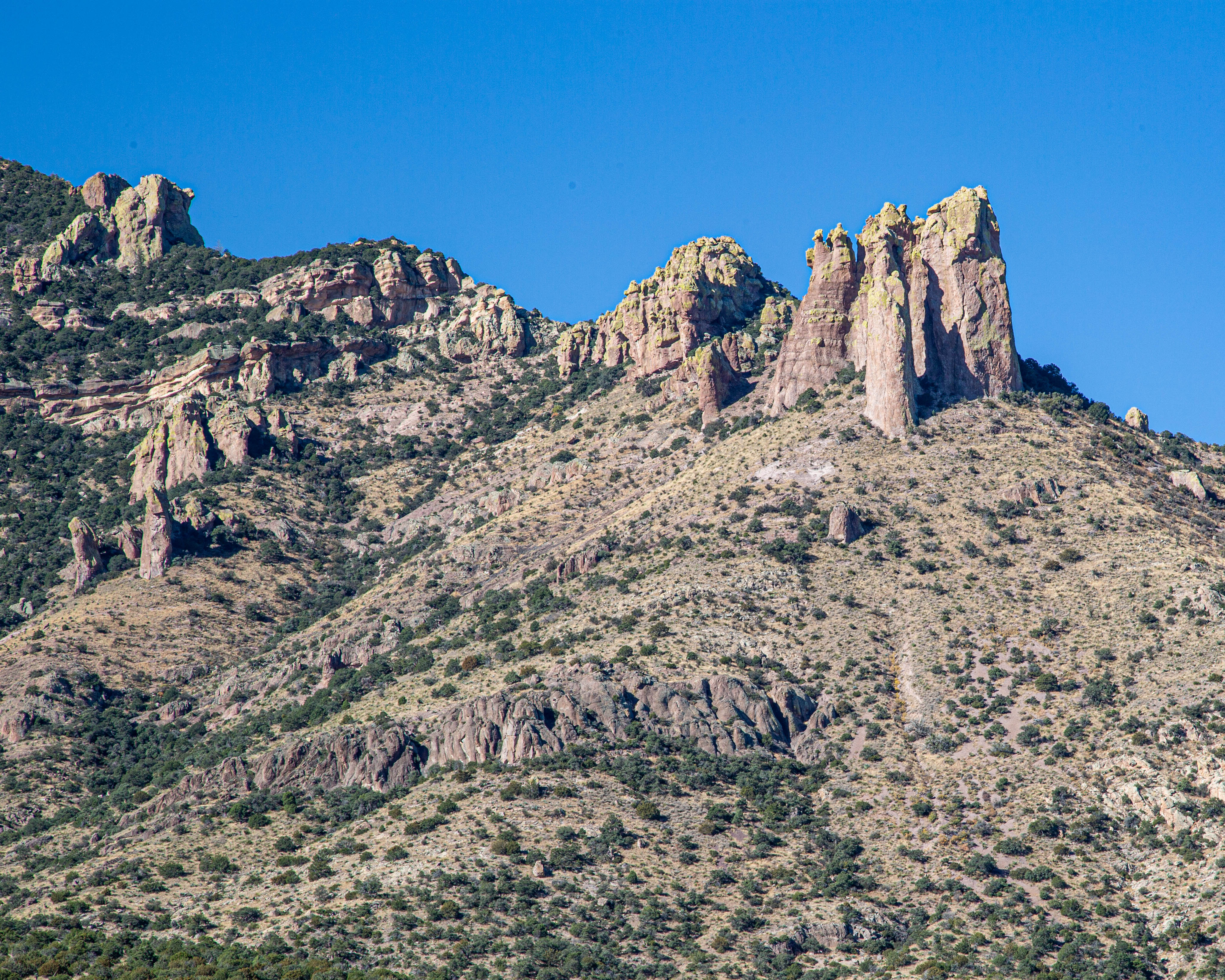 Landscape photography was the target for the rest of the morning and mid-day. A drive up Cave Creek Canyon yielded incredible views of the rugged rhyolite mountains. The subtle hues of tan, pink, green, and yellow were almost breathtaking. The sun did not rise over the canyon walls until near noon further muting the canyon colors. A short hike in the foothills provided a different view at each turn of the trail.