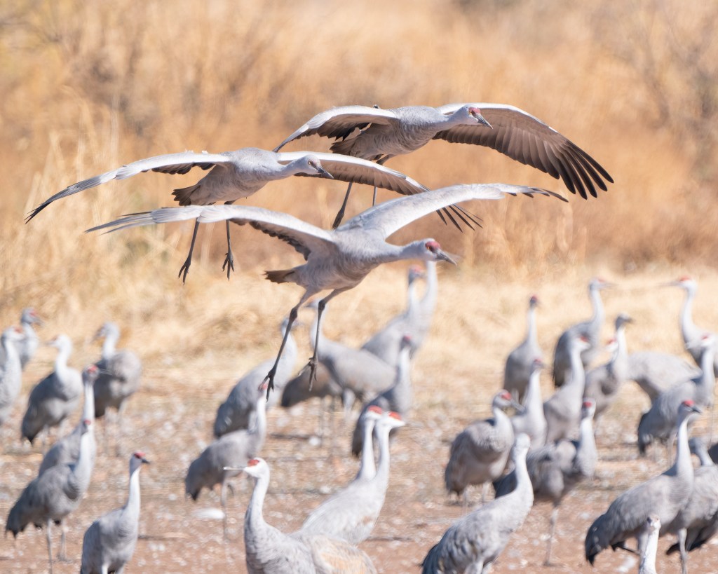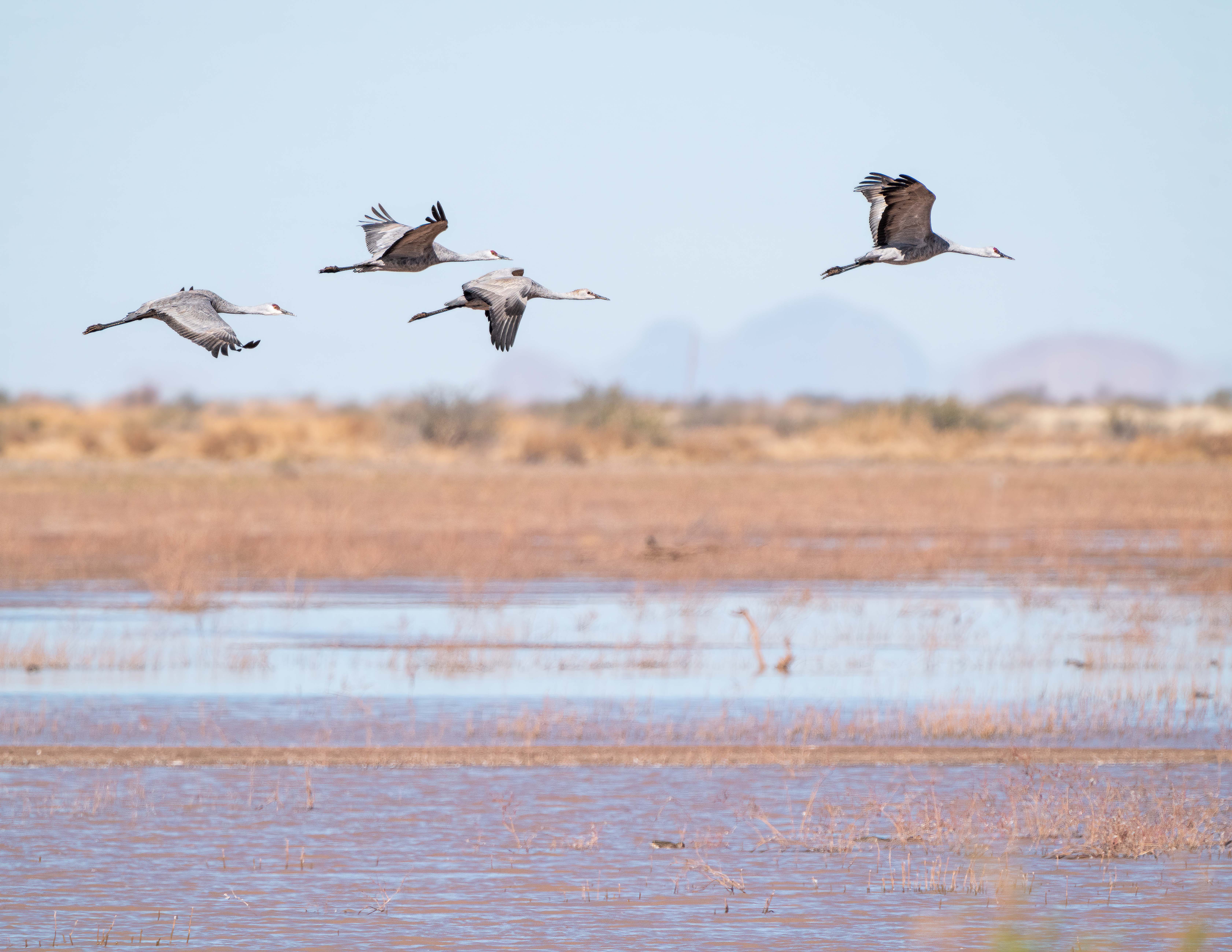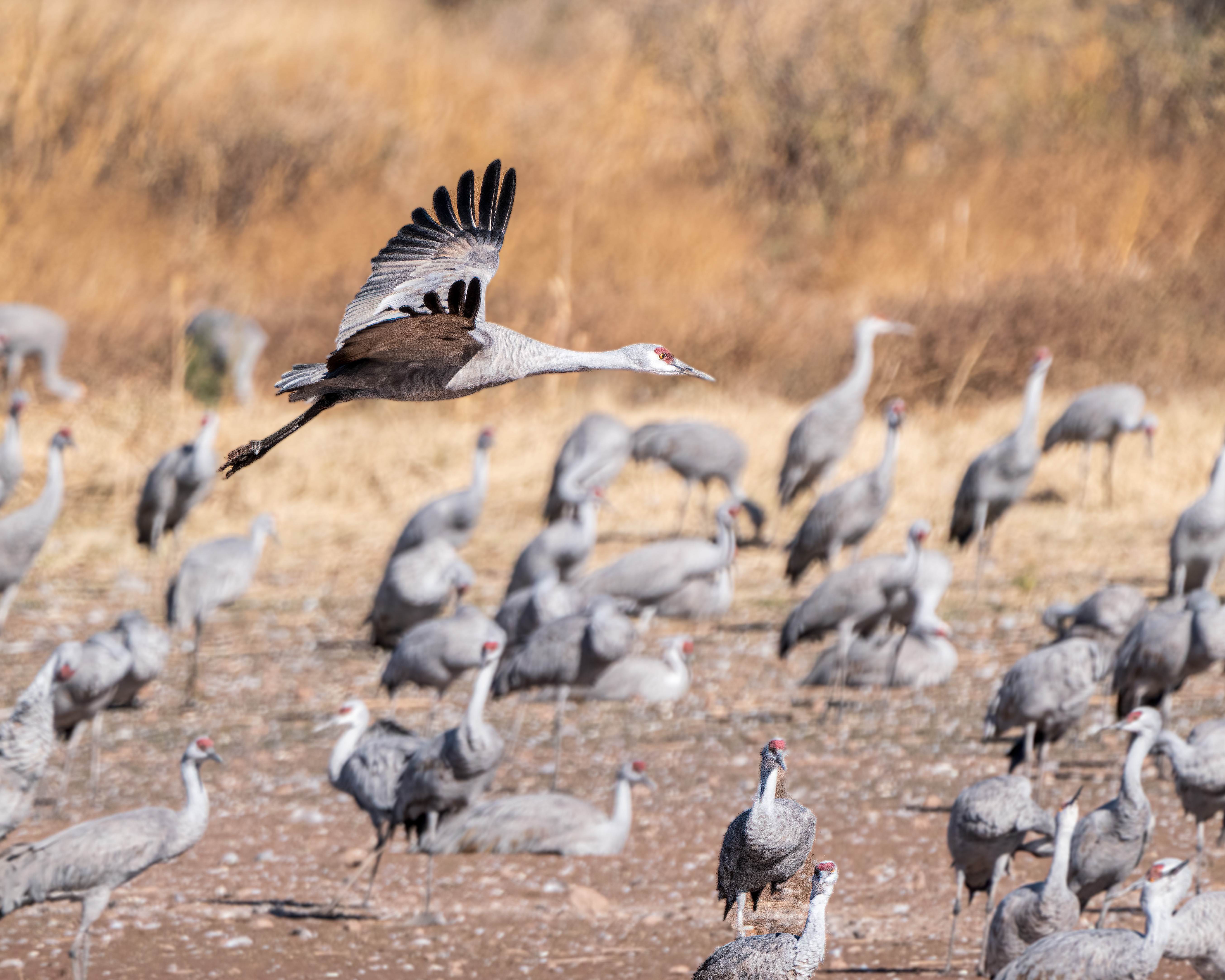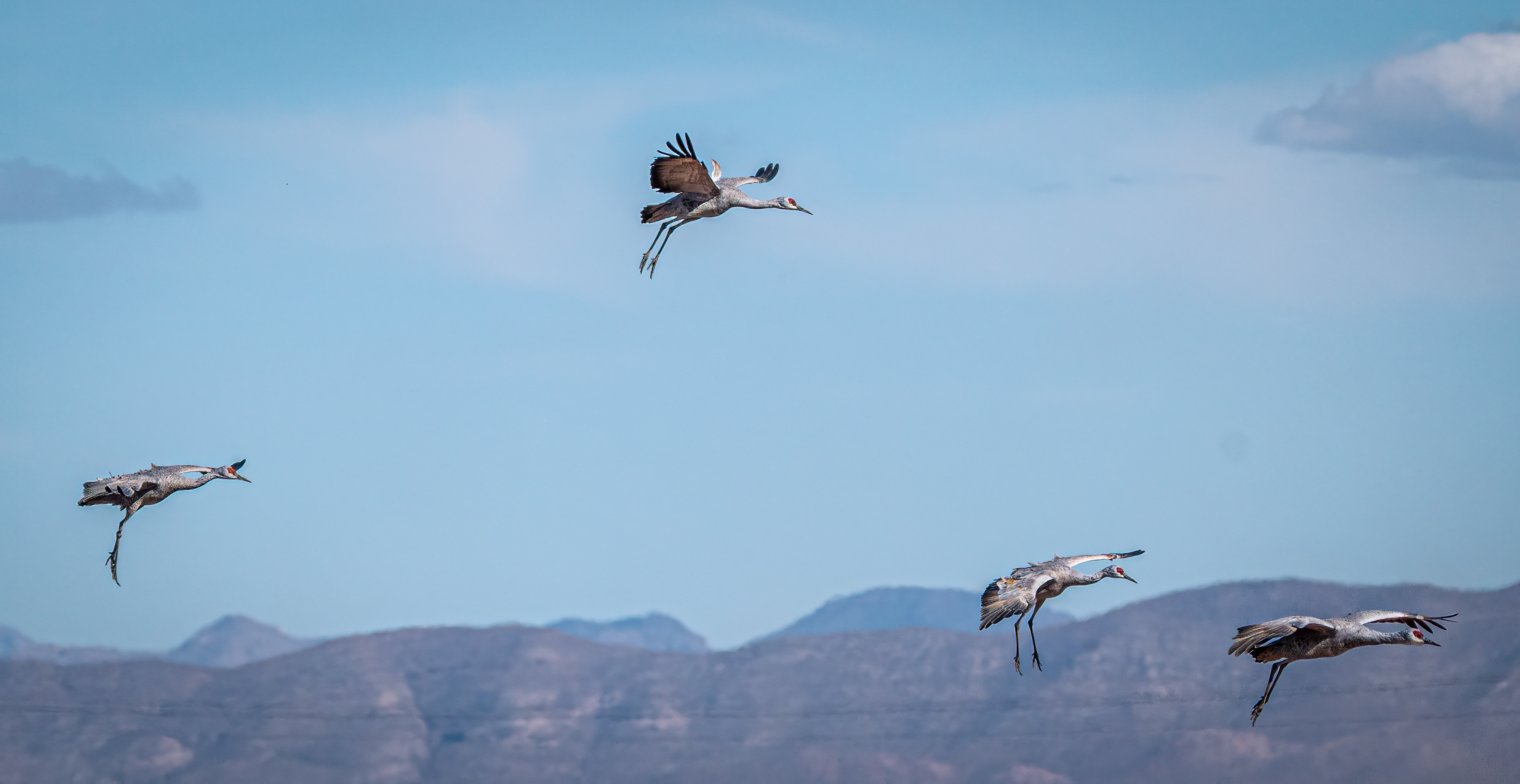 Located in southeastern Arizona, Whitewater Draw is a major roost site for Sandhill Cranes, Arizona Game and Fish Department currently manages Whitewater Draw for waterfowl, cranes, and other wetland associated birds. Each winter Whitewater Draw offers memorable sights and sounds of more than 20,000 sandhill cranes. These birds spend the night standing in Whitewater Draw’s shallow waters to evade predators, and then fly out each morning about sunrise to feed and socialize in the surrounding area. They begin returning to Whitewater Draw about 11 AM, continuing into the afternoon and evening.