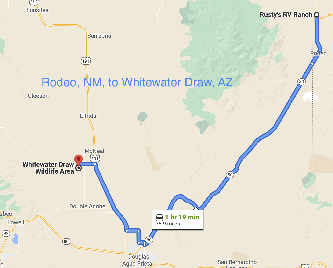 The next leg of the trip took us from Rusty’s RV Ranch in Rodeo, NM, to Whitewater Draw near McNeal, AZ. As a result of the short drive, we arrived via a few miles of dusty gravel roads just as they began returning from their morning feeding.