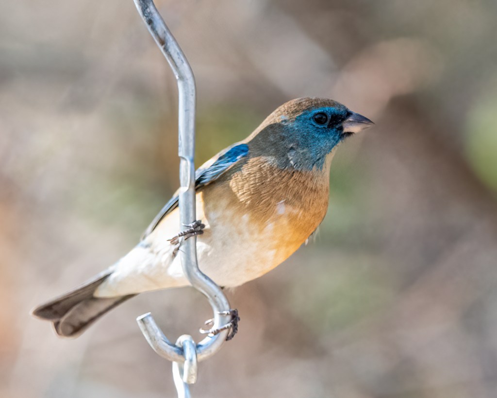 And then, a somewhat muted but colorful bird landed on the water container atop the hummingbird feeder. It looked familiar, and I opined that it was a Northern Parula. The volunteer expert ornithologist looked at the photo on the camera’s monitor and corrected the identification as a Lazuli Bunting. Though not exciting to the other birders there, it was a LIFER for me, whereas a Northern Parula landed on one of the feeders at the Norfork house several years ago. Photographing the Lazuli Bunting made my day!