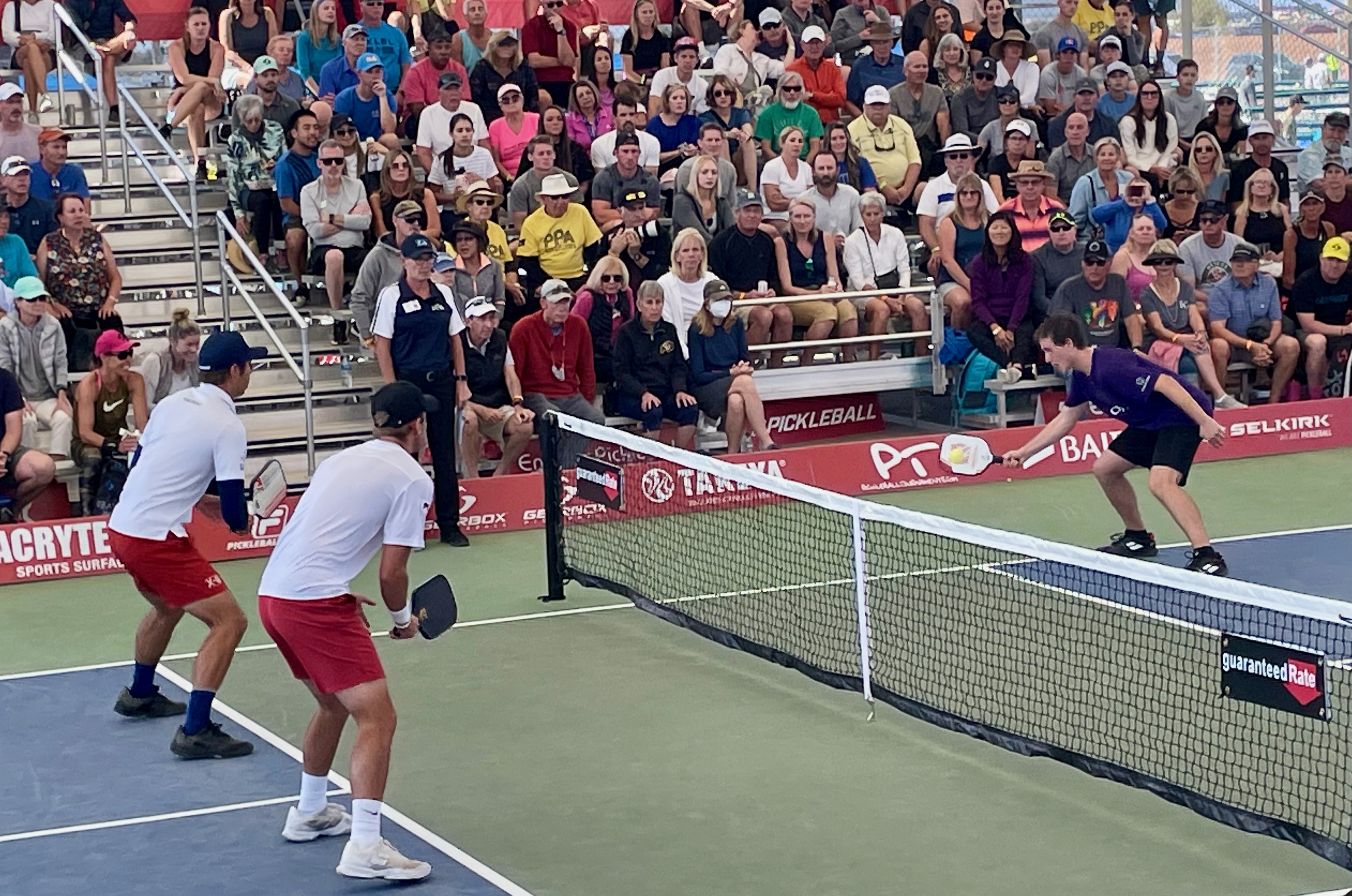 A trip to the greater Phoenix area was in order for today. The number one reason for going was to attend the Professional Pickleball Association (PPA) Foot Solutions Arizona Grand Slam—41 courts of outstanding pickleball, including 36 outdoor courts, 4 Medal Courts, and a Stadium Court. We focused our attention on the the Stadium Court where notable pros were playing mens’ and women’s doubles. Most of the top-ranked players were there, and they are awesome pickleball players. The photos below feature Ben Johns and his brother, Collins. Ben Johns is currently the highest ranked men’s player in the world in all three divisions: singles, men’s doubles, and mixed doubles. A student at the University of Maryland majoring in Materials Engineering, Johns grew up in Gaithersburg, Maryland playing tennis and table tennis. In March of 2016, he first picked up a pickleball paddle and instantly fell in love with the game. He is 22 years old and has a net worth of $1.2 milliion. By the way, he has the highest percentage of shots playing the kitchen line of any of the top ranked pro players; there’s a lot to be said for dinking!