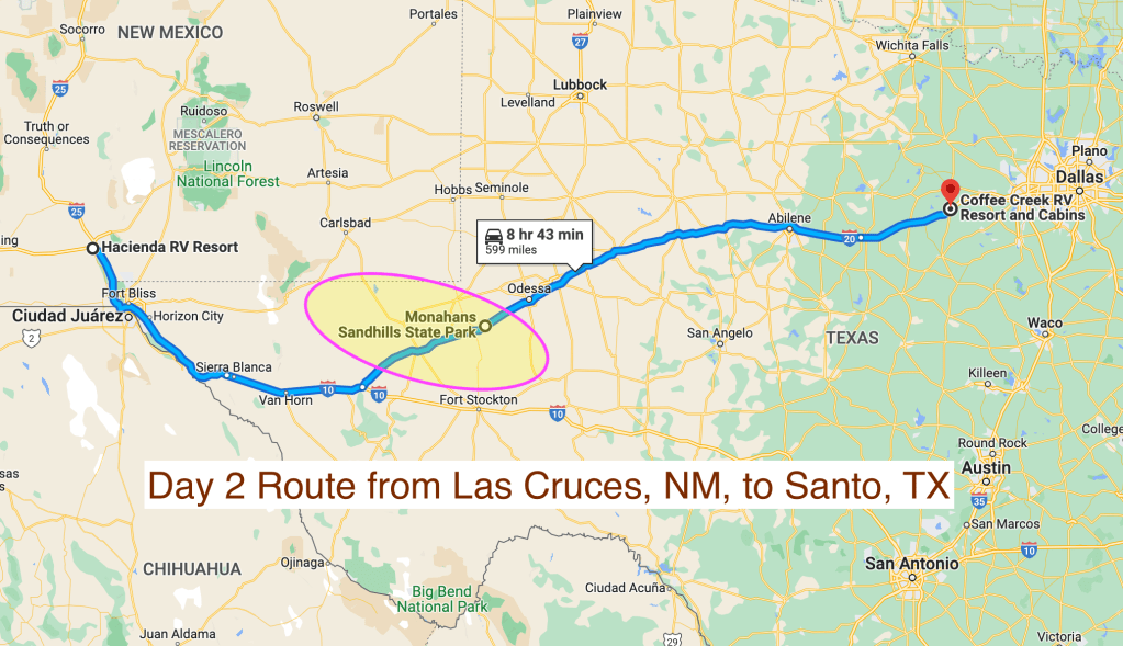 The goal Wednesday was to continue southeast through El Paso, then east to Monahan Sandhills State Park in Monahan, Texas, to overnight; I had stopped there in November 2020 and November 2021 on the way from Arkansas to Arizona. This would be a relative short and easy driving day. Upon arrival, the office advised that they had no vacancies—it was impossible to reach them via phone! Consequently, we made the camping loop so Kay could see the dunes.