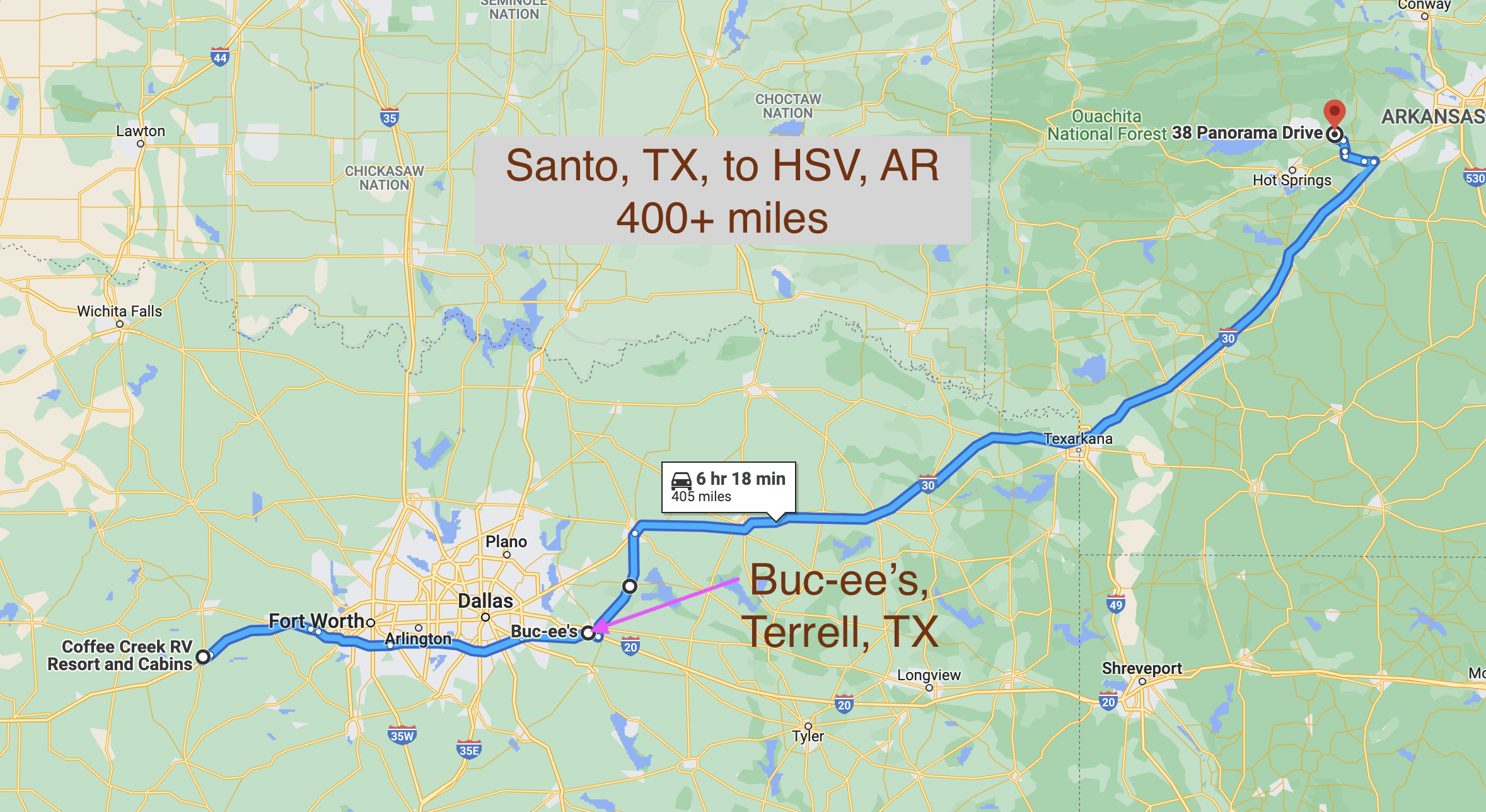Thursday, the drive took us east towards Dallas, then northeast to home, a total of over 400+ miles. The trip was uneventful, though we did stop at Buc-ee’s fulfilling a bucket list item for Kay.