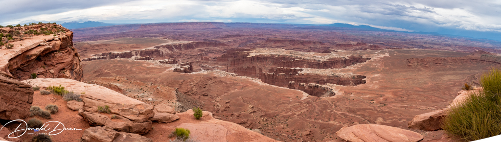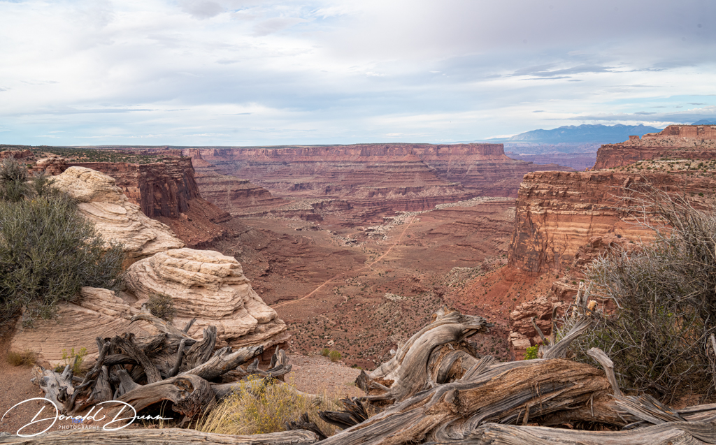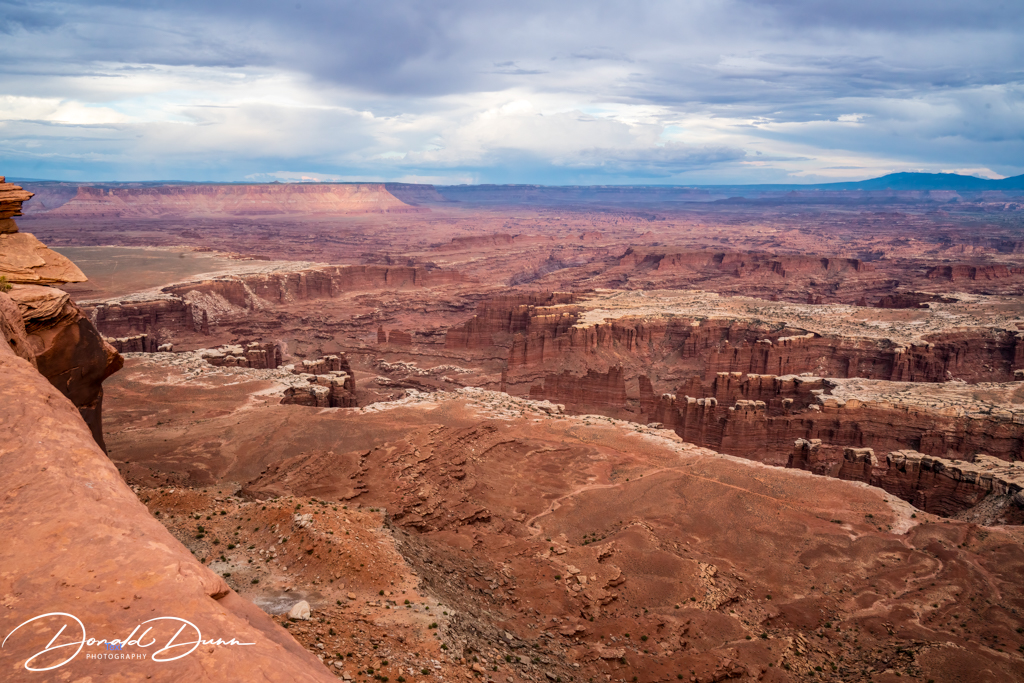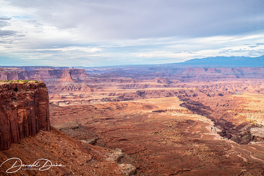 After checking into our motel and grabbing a “take away” bite to eat, we drove north to the Island in the Sky District of Canyonlands National Park. I visited there briefly in the mid 1970s, but did not take enough time to smell the roses or take many photographs; Kay had never been there. At Grand View Point Overlook, the majesty of the canyons spread to the horizon. Grand View Point is the southern-most spot on Canyonland’s high mesa, the Island in the Sky. This whole area of the mesa has a 1,000 foot vertical wall, and the trails go right up to the edge—just a little gust of wind, and camera equipment and photographer are over the edge! Laid out below the Grand View Point is a complex network of canyons carved by the converging Colorado and Green Rivers.