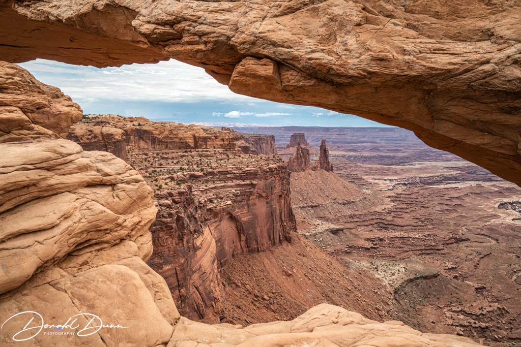 After the long awaited photograph of the gooseneck bend described above, we returned to the Island in the Sky District of Canyonlands National Park, just a few minutes away. Our goal was to photograph Mesa Arch, the crown jewel of Canyonlands National Park. This pothole arch on the easter edge of the Island in the Sky mesa perched at the edge of a cliff with views of canyons, Monster Tower, Washer Woman Arch, Airport Tower, and the la Sal Mountains in the distance.Sunrise is the ideal time to photograph Mesa Arch, but the crowd of photographers can be overwhelming. Even at mid-day, the site was crowded, mostly by a large foreign “family” group of about a dozen and a half people. It seemed they took forever to pose singularly and in groups. We have seen groups like this before in other national parks, traveling in two or three vans. Anyway, we waited our time and snapped a couple of photos.
