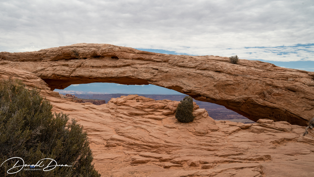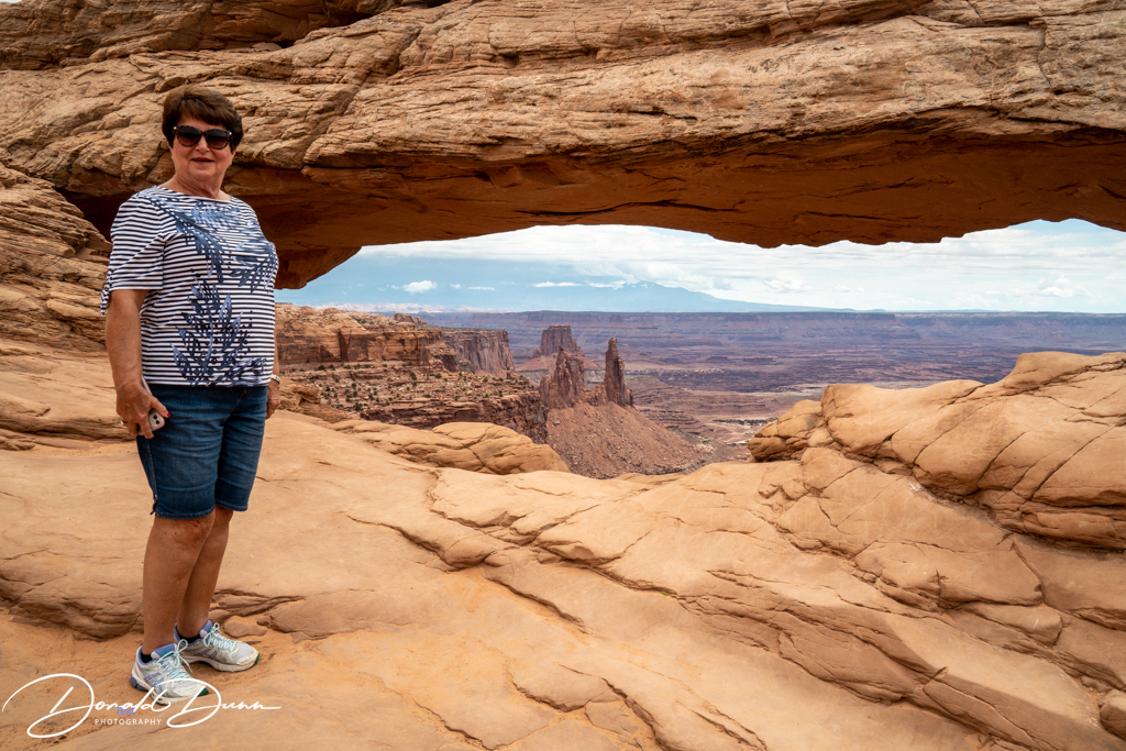 After the long awaited photograph of the gooseneck bend described above, we returned to the Island in the Sky District of Canyonlands National Park, just a few minutes away. Our goal was to photograph Mesa Arch, the crown jewel of Canyonlands National Park. This pothole arch on the easter edge of the Island in the Sky mesa perched at the edge of a cliff with views of canyons, Monster Tower, Washer Woman Arch, Airport Tower, and the la Sal Mountains in the distance.Sunrise is the ideal time to photograph Mesa Arch, but the crowd of photographers can be overwhelming. Even at mid-day, the site was crowded, mostly by a large foreign “family” group of about a dozen and a half people. It seemed they took forever to pose singularly and in groups. We have seen groups like this before in other national parks, traveling in two or three vans. Anyway, we waited our time and snapped a couple of photos.