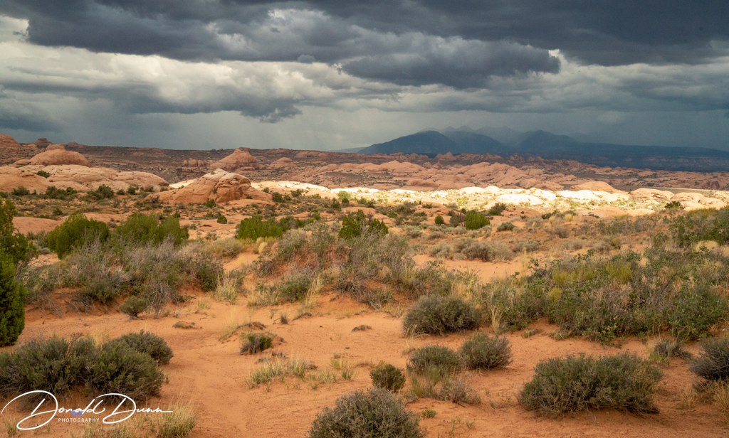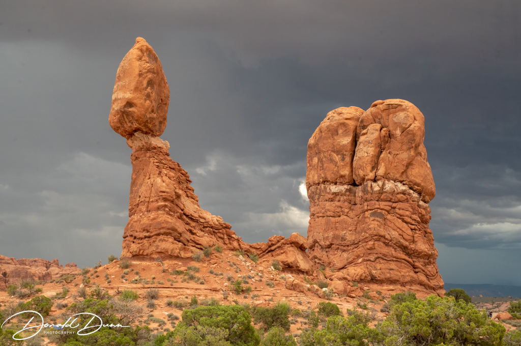 Later in the afternoon, we did a quick driving tour of Arches National Park; it was Kay’s second visit and my third. Knowing it would be crowded (you have to reserve a time slot to visit), we did not have any particular goals in mind—just sightseeing. That turned out to be a good thing as a storm rolled in and it rained on us most of the time we were there. We did manage to get a few photos between rain storms.