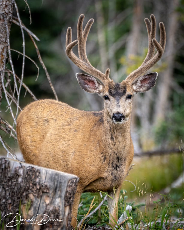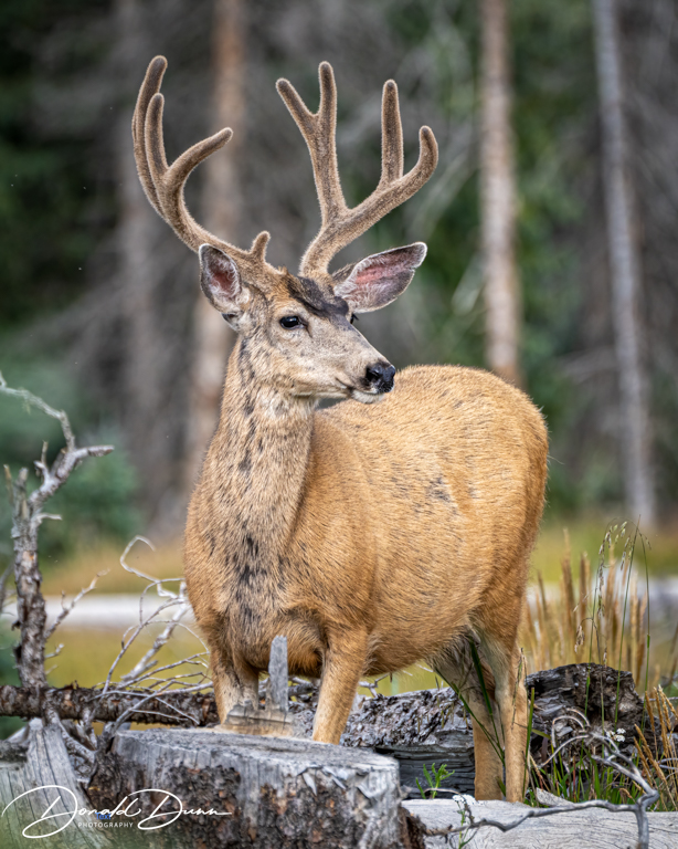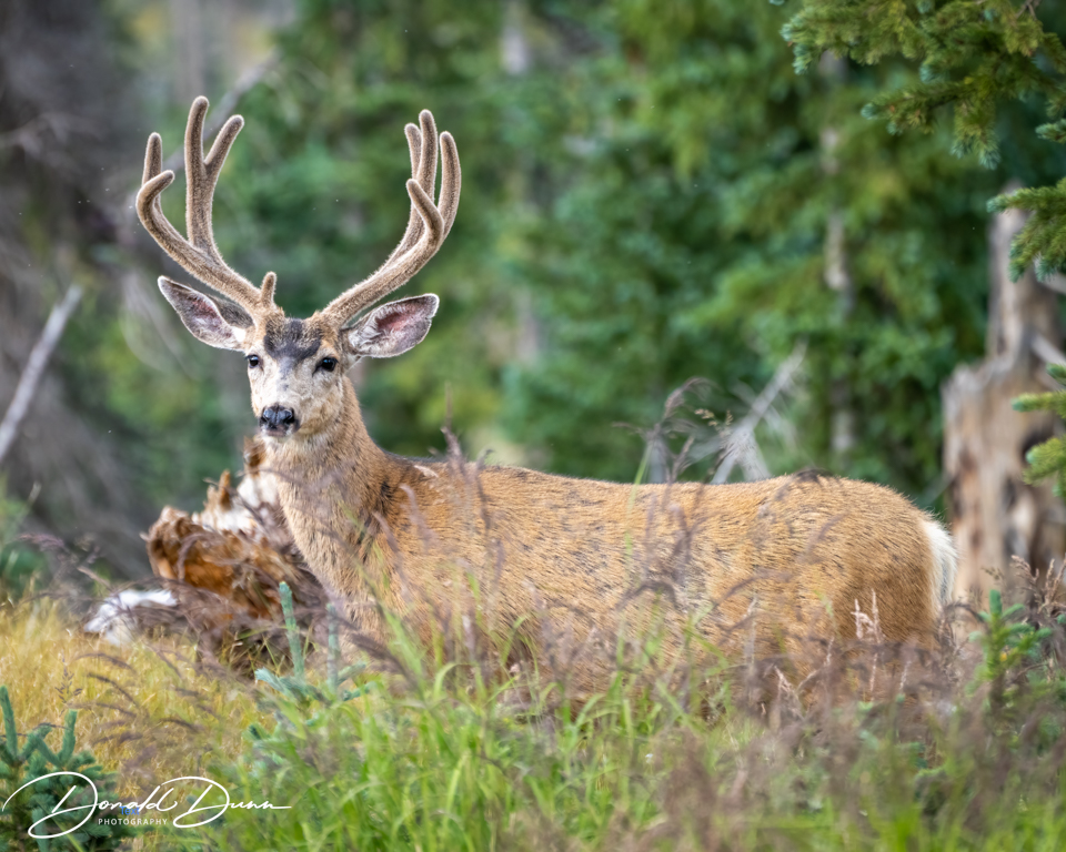 And then, continuing a couple hundred yards, we spotted a group of male mule deer working their way uphill toward us. We patiently waited, and all of the velvet-horned bucks posed. The largest was especially photogenic and offered three portrait photos.