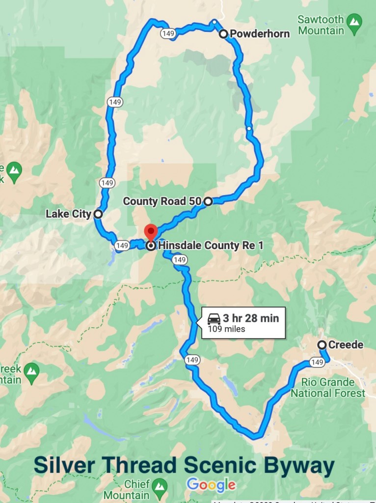 Anxious to explore the high country near us, we opted to drive the Silver Thread Scenic Byway, at least to Lake City. Points of interest included the mighty Rio Grande River for flyfishing on gold medal waters, Wagon Wheel Gap, the Historic Bachelor Loop and Creede Mining District, the spectacular and unrivaled North Clear Creek Waterfalls, scenic Slumgullian Pass that cuts through a natural earthflow, and Colorado’s second-largest natural lake – Lake San Cristobal—more about these in future blogs.