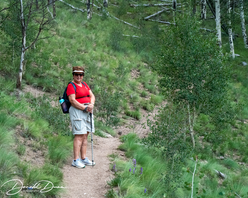 Lunch was at a local eatery, and then it was back to the cabin to change clothes. We then drove north on the Silver Thread Scenic Byway to the South Clear Creek Falls trailhead. The short hike (1/2 mile roundtrip) starts in the Silver Thread Campground in an aspen grove.