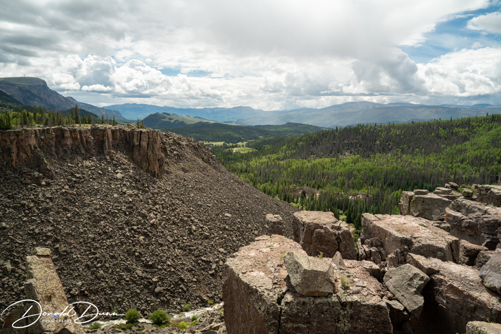 On Sunday, we drove north again on the Silver Thread Scenic Byway to see sights missed on Friday. Driving from near Creede, we traveled west about 26 miles, about halfway between Lake City and Creede, where we saw the sign for the North Clear Creek Falls. Turning right, we traveled for another half mile on paved Forest Road 510 to the Overlook. Because of the vertical drop into Willow Canyon, the observation area had been fenced. The area had new toilet and picnic facilities, and is considered handicap accessible. We first walked to the top of the hill to view Willow Canyon.
