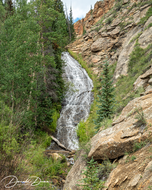 From North Clear Creek Falls, we drove east on the Silver Thread Scenic Byway about one mile to Forest Service Road 515 (Hermit Lakes Road), then 1 1/2 miles west (left) to the Brown Lakes State Wildlife Area. The parking area and trailhead for Rex Falls are straight across from the Troutvale Reservoir as you enter the Wildlife Area. While the short hike was not difficult, it was not without pain. There was a large yellow jacket nest about halfway up on the upper trail. About five feet before  log across the trail, the nest was in or on the ground. It is partially exposed on the right side of the trail. I received a several stings on my left leg hiking to the falls, and a half dozen stings on my right leg hiking back to the trailhead. You’d think I knew better!
