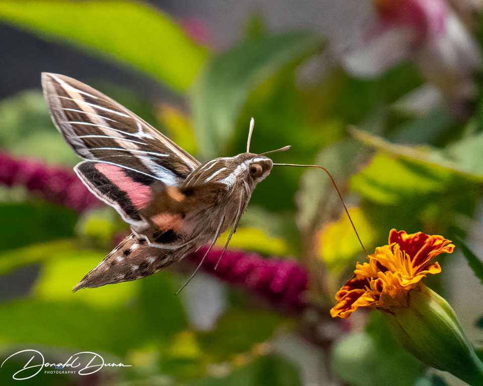 Kay discovered a hummingbird moth, common name “Whitelined Sphinx Moth,” nectaring on hanging baskets—a real treat for this photographer.