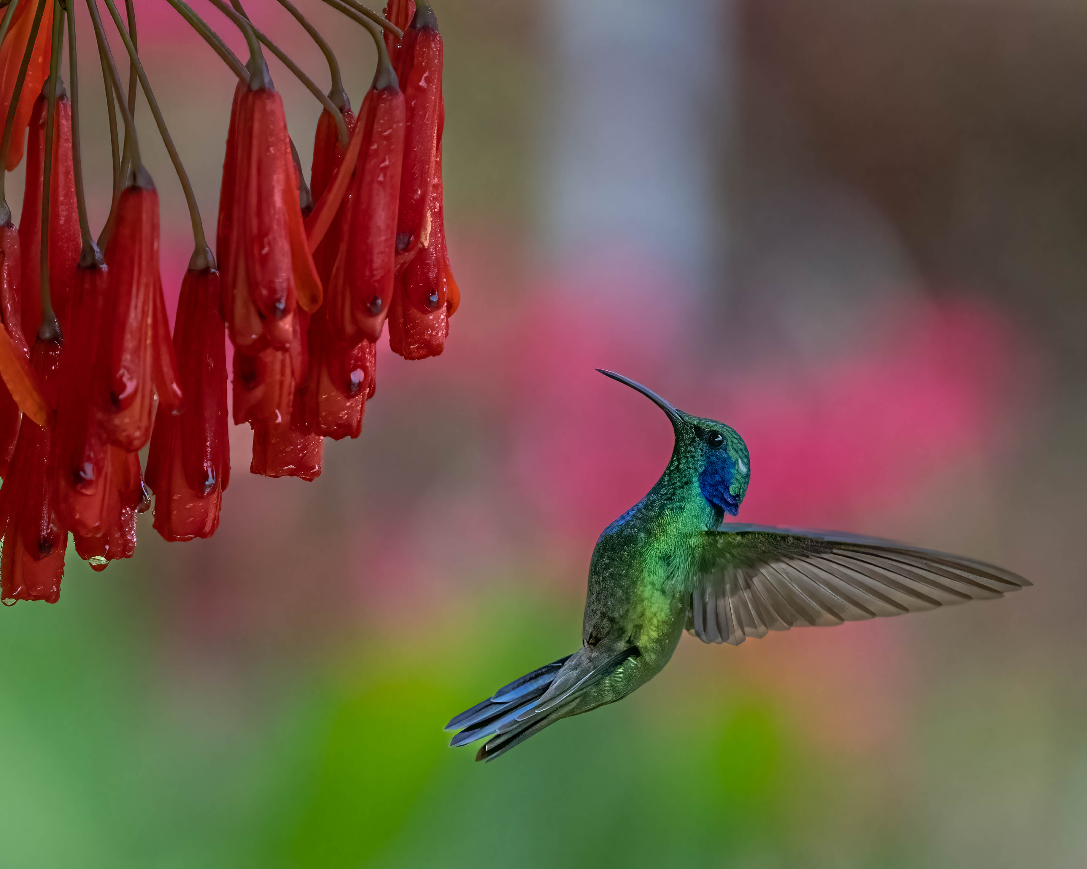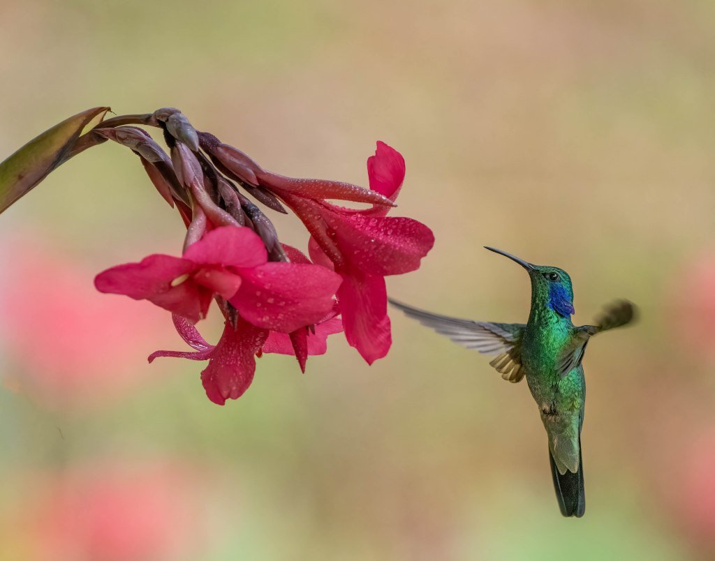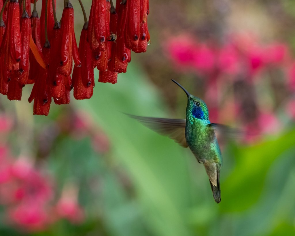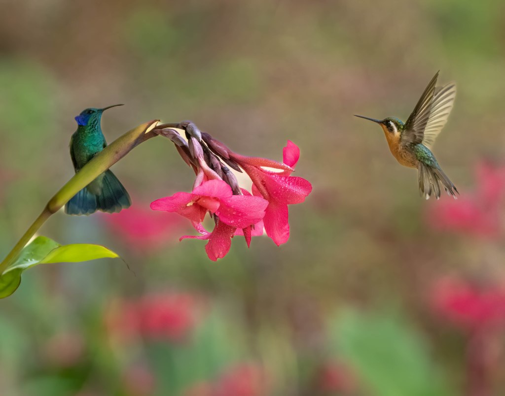 Seemingly, after observing and photographing the Resplendent Quetza this morningl, anything and everything left on the trip would be considered anticlimactic. Not to be outdone, the endemic hummingbirds of the mountains of San Gerardo de Dota put on quite a show in the afternoon. We traveled by private van to a hummingbird haven, Batsu Garden, designed specifically for birdwatching and photography. Feeders and fruits attract the birds to viewing platforms, while trails wind through the blooming gardens had been established to enhance bird watching and photography. This provided a great opportunity for fast speed photography, fill flash photography, and birds in flight. I shot over 1,000 photos of hummingbirds while there!
