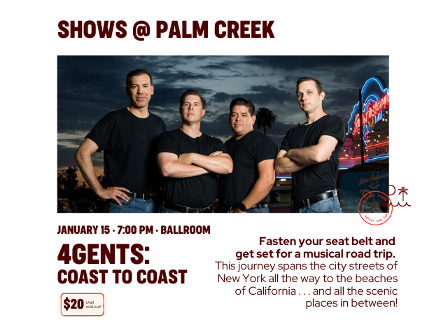 And, we attended a show in the evening, “Coast to Coast” by the vocal quartet, the 4 Gents. My oh my, but they were awesome; possibly the best show we’ve seen in our almost 15 years of wintering in Texas and Arizona. They specialize in doo-wop and popular music from the 50s and 60s, sticking to the original artists’ harmonies and choreography. All four singers are classically trained, and have experience singing opera. Again, they were awesome.