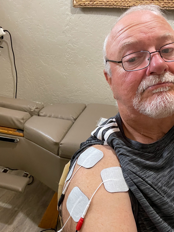 Kay injured here left hamstring Saturday, thus neither of us did much of anything Sunday or Monday. Finally giving in to the pain, I visited a chiropractor on Tuesday, and he did a couple of adjustments and activated a TENS unit for about 20 minutes. He was a great practitioner and surprisingly referred me to a sports ortho clinic and arranged for an appointment there in the afternoon.