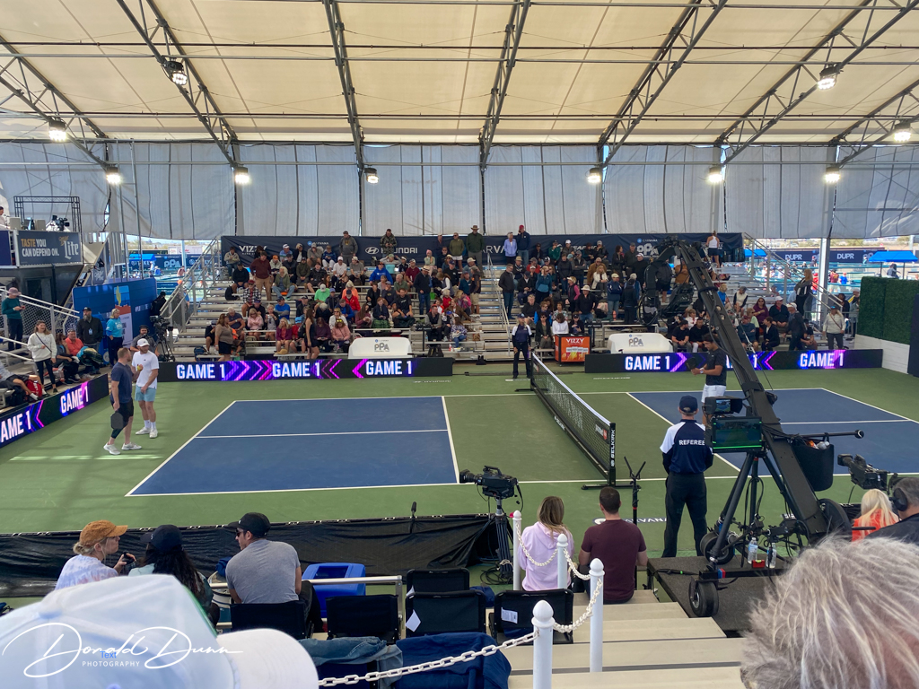 On Saturday, February 18, we traveled to Bell Bank Park in Mesa to watch the Professional Pickleball Association tournament. Having watched a lot of the players live and on You Tube, it seems as if they are neighbors. The game among the pros (all very young, athletic, and mostly tall) is becoming so fast and physically challenging, that amateurs are emulating their play. The game is evolving so quickly that future play among us minions will appear to be in slow motion and have to be broken down by age group.
