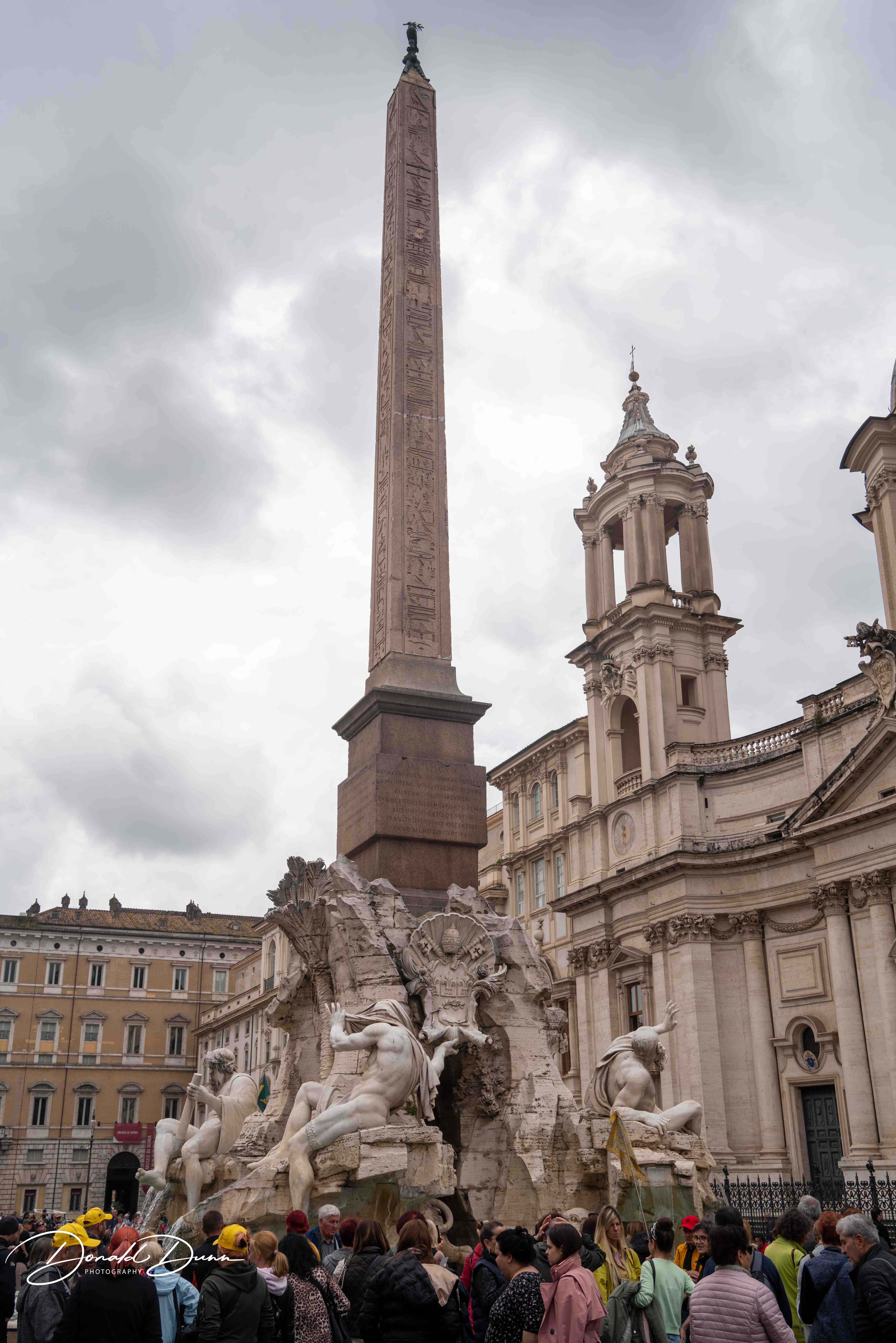 The Fountain of the Four Rivers depicts Gods of the four great rivers in the four continents as then recognized by the Renaissance geographers: the Nile in Africa, the Ganges in Asia, the Danube in Europe and the Río de la Plata in America. The Fountain of Four Rivers is topped by the Obelisk of Domitian. It is dated to the reign of Roman emperor Domitian (81-96 AD). Originally set up in the Circus of Maxentius, the obelisk was broken and buried over centuries. Although Pope Sixtus V was aware of its location, it was not excavated until Pope Innocent X, in 1649.