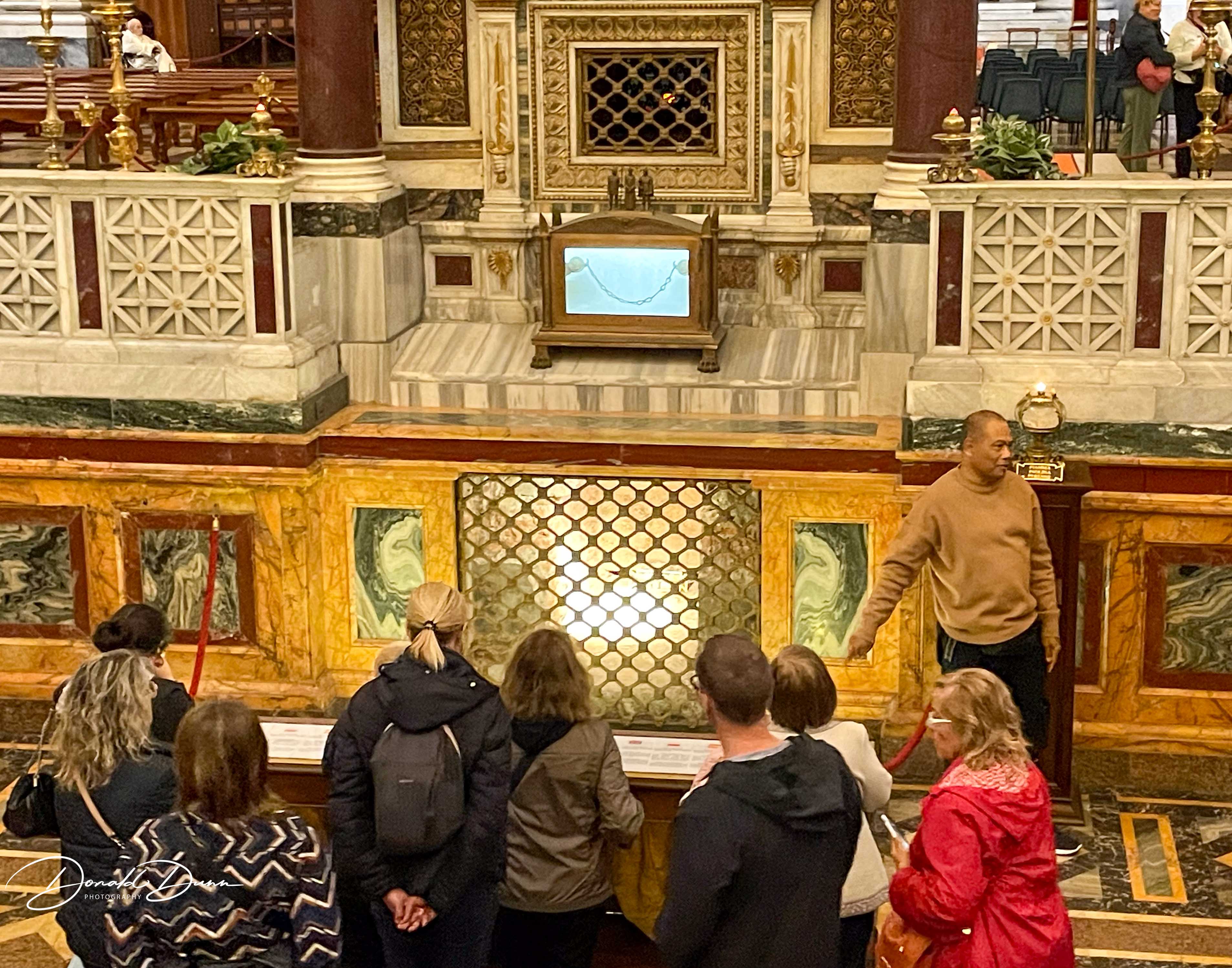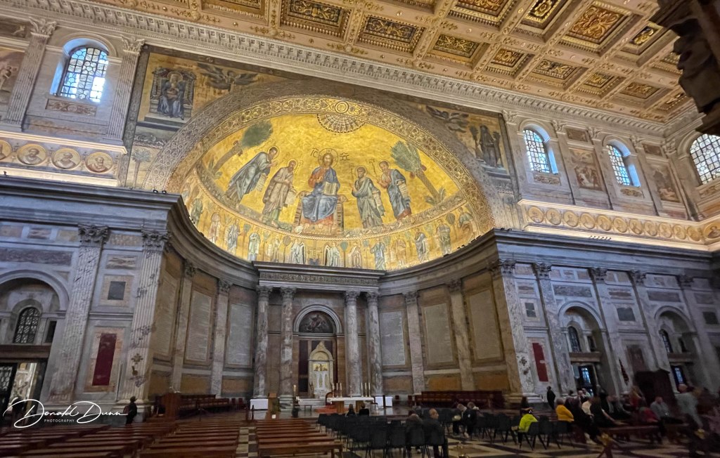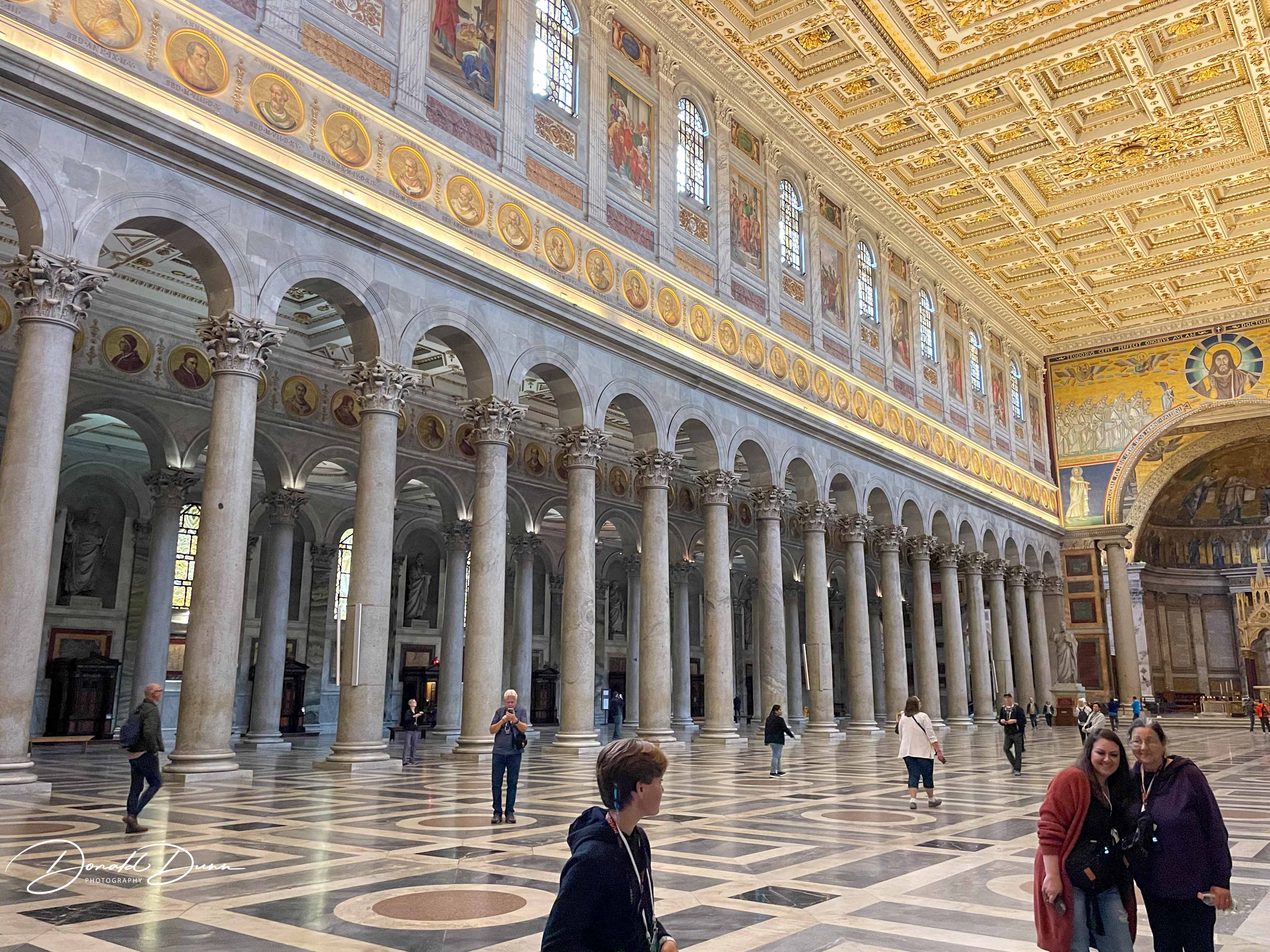 After breakfast, we toured the Basilica of St. Paul Outside-the-Walls. The present structure stands over the place where Constantine built the first church over Saint Paul’s grave. The church features a portrait of every Pope that has served the church. Next, we entered the Catacombs of Callixtus, built along the Appian Way. Here, 16 Popes from the 2nd through 4th Centuries were interred, though they have been removed to various churches over the centuries.