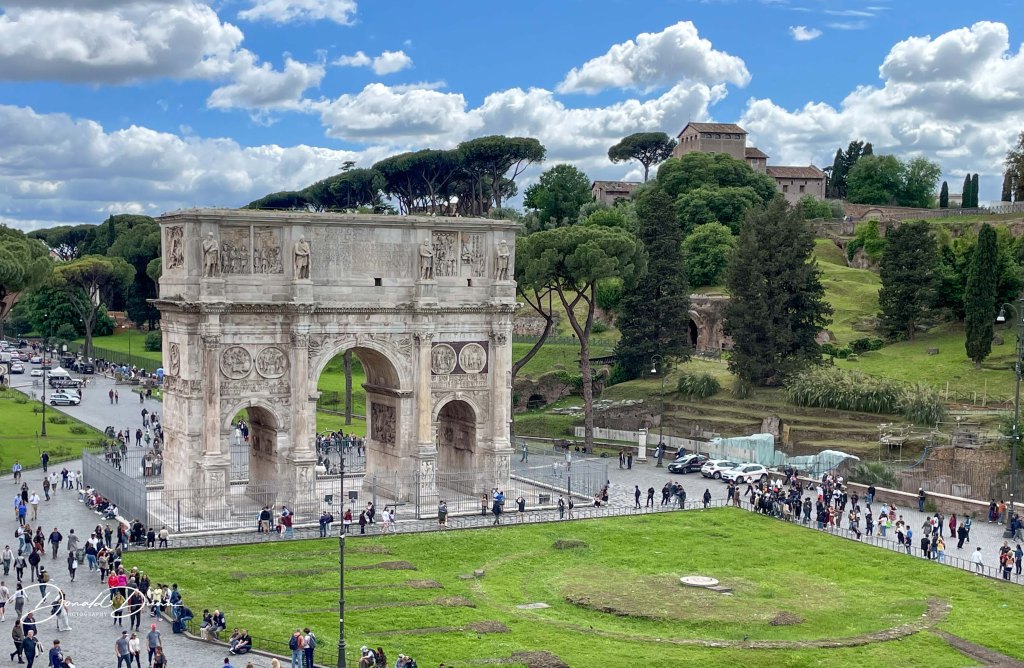 From atop the Colosseum, we saw the the Arch of Constantine and the Forum.The Arch of Constantine is a triumphal arch in Rome dedicated to the emperor Constantine the Great. The arch was commissioned by the Roman Senate to commemorate Constantine’s victory over Maxentius at the Battle of Melvin Bridge in AD 312. Situated between the Colosseum and the Palatine Hill, the arch spans the Via Triumphalis, the route taken by victorious military leaders when they entered the city in a triumphal procession. Dedicated in 315, it is the largest Roman triumphal arch; the arch is constructed of brick-faced concrete covered in marble.