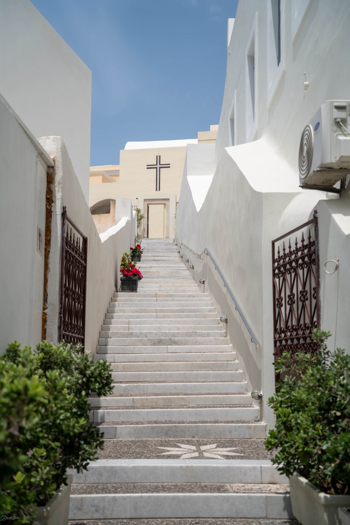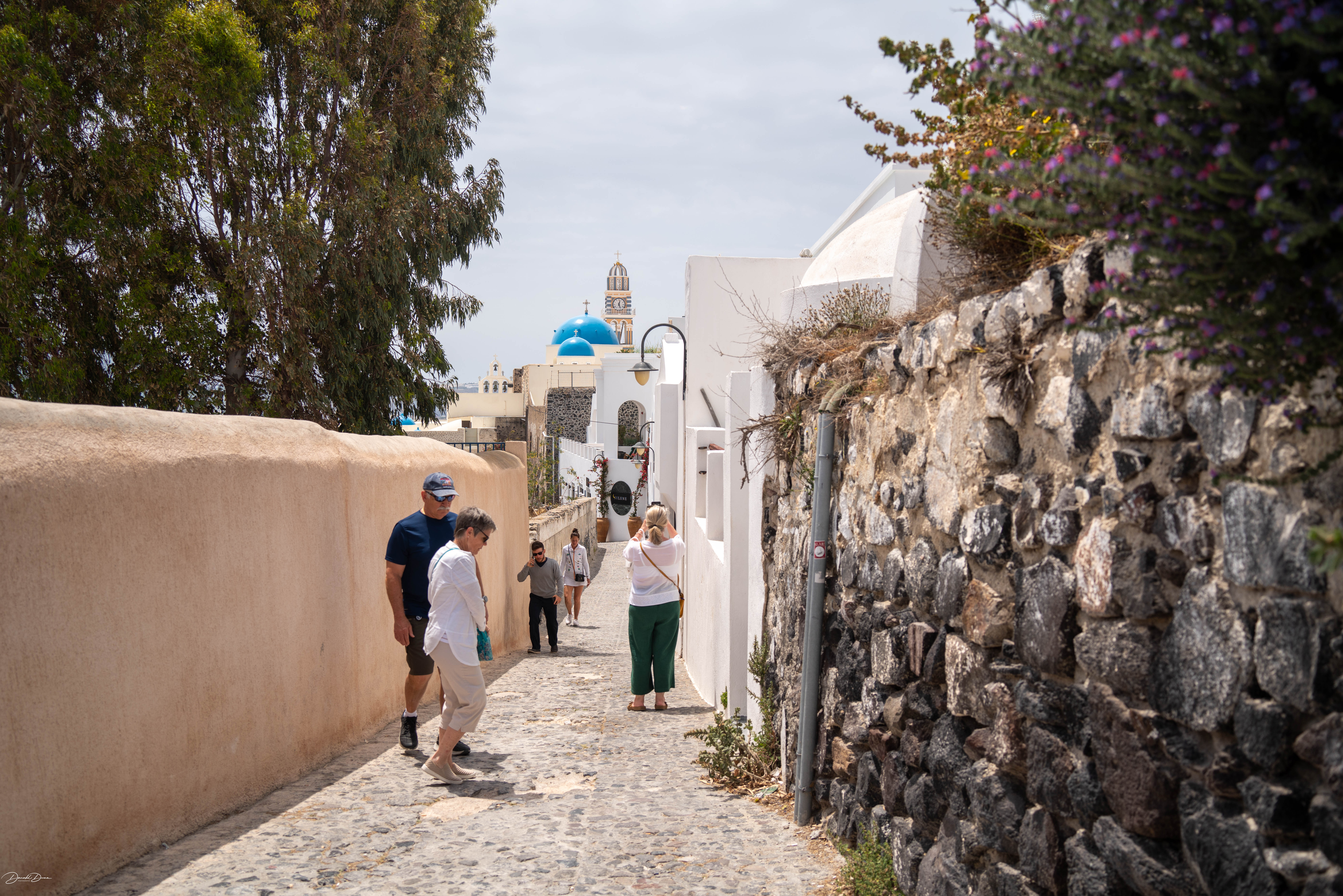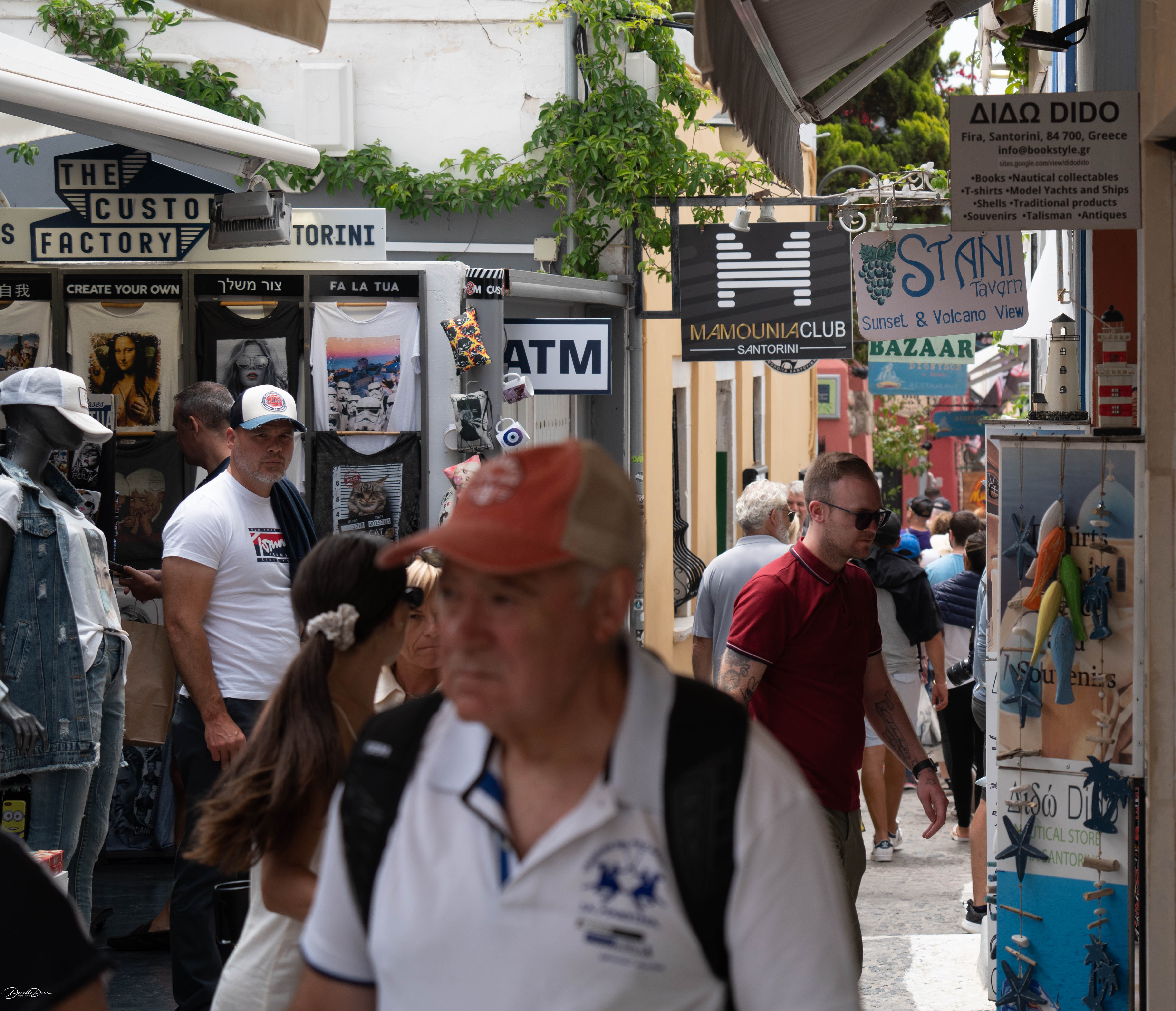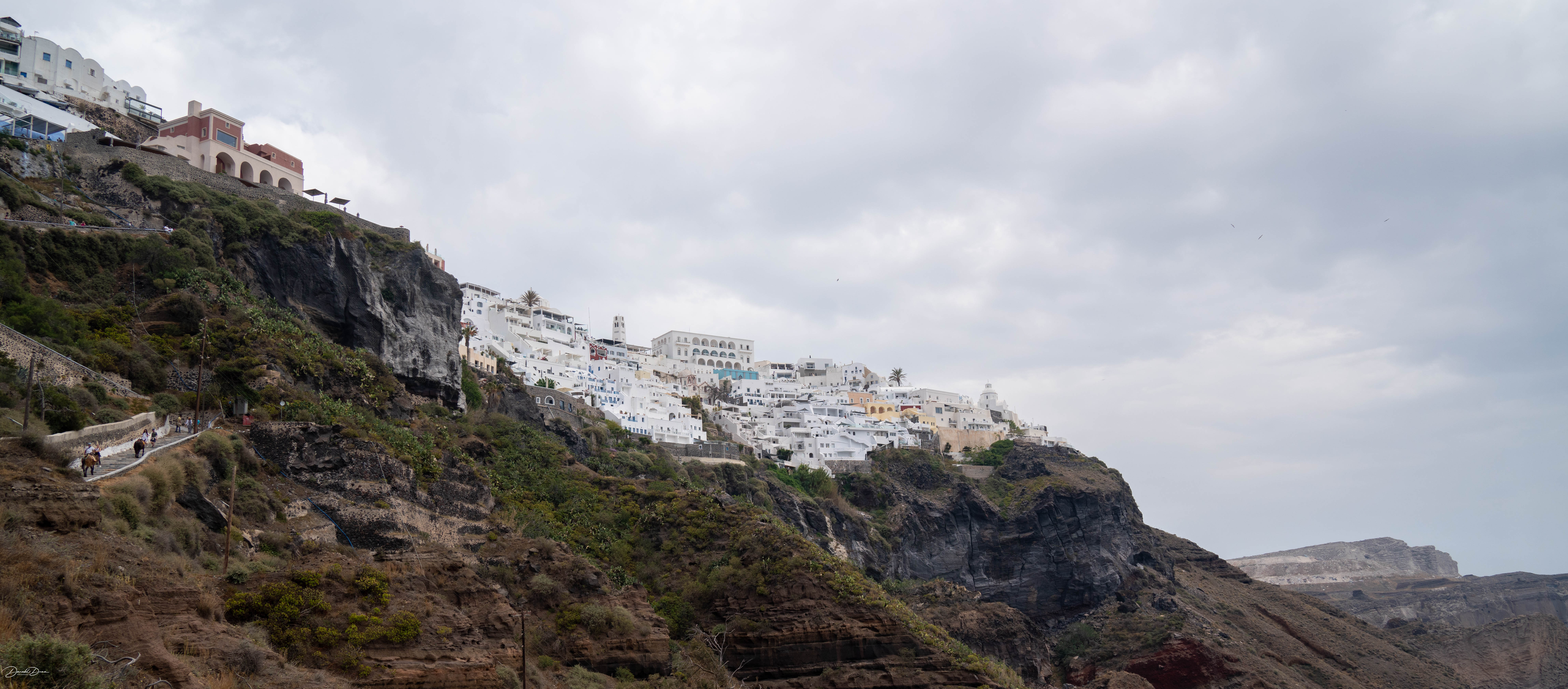 There, we were met with extremely long lines (20+ minutes) to catch the cable car to the top of the island to its capital, Fira, a bustling cliff-top town awash with old cathedrals, enthralling museum collections and cozy tavernas. (The alternative to the cable car was to climb the difficult switchbacks. Regrettably, several people who walked the switchbacks slipped and fell on the rain-slicked cobblestones.)