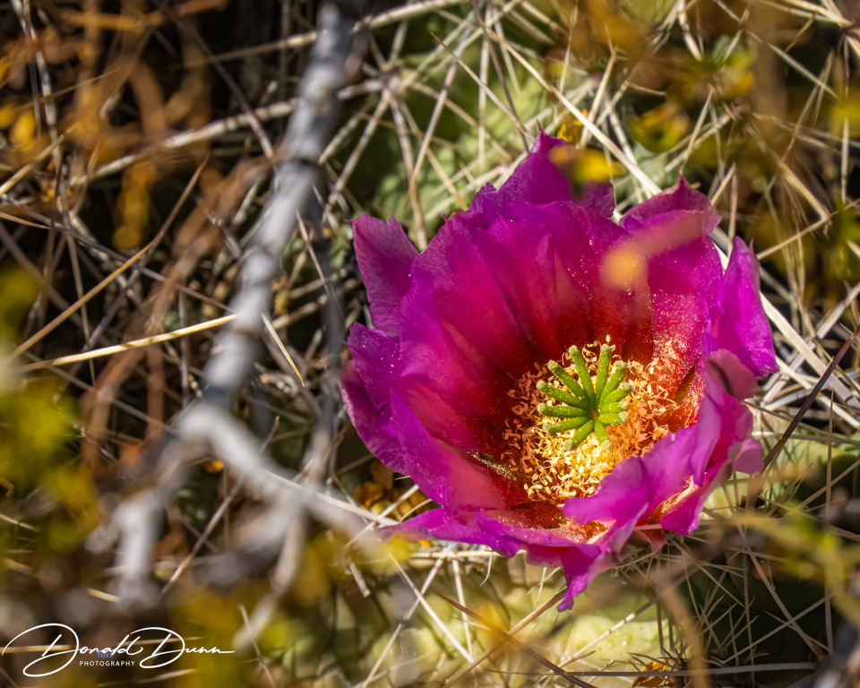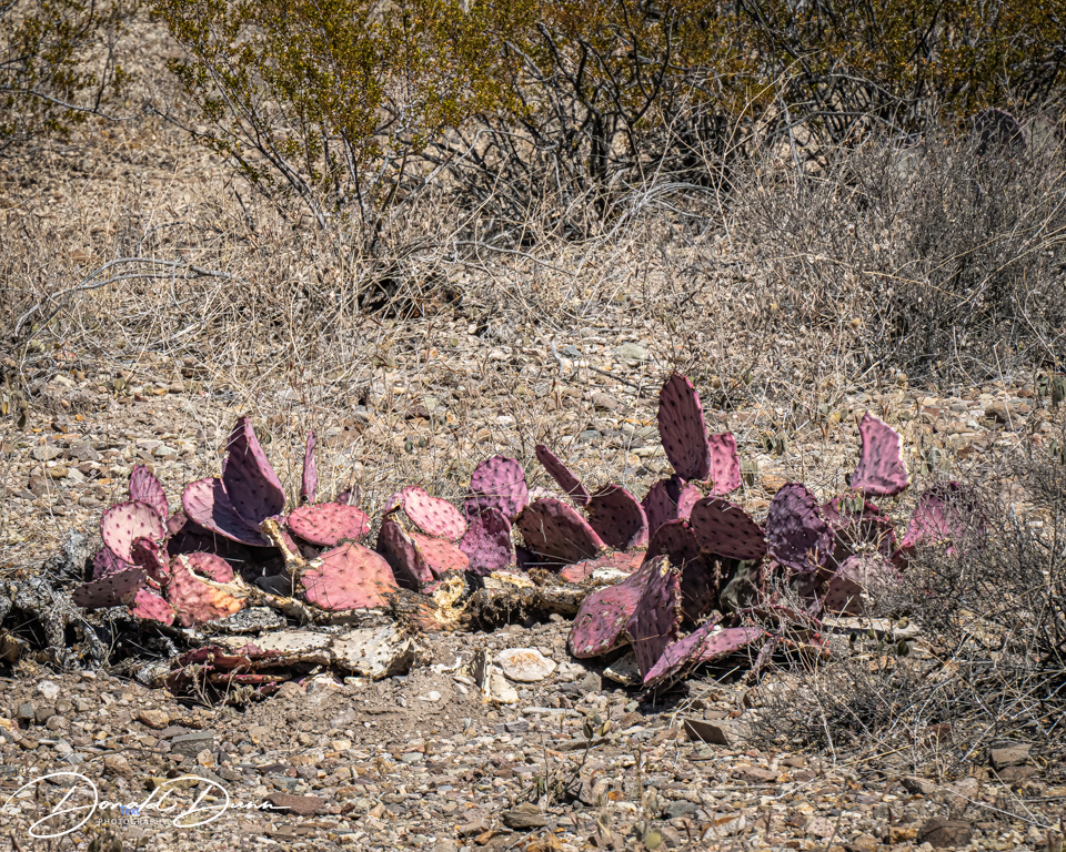 It was on one of the viewing platforms that I almost met my demise. Stepping high to a concrete platform, I tripped and fell, making a three-point landing: both knees and my CAMERA/LENS. While I as bloodied and skinned up, the camera received the brunt of the fall, receiving several deep scratches. Fortunately, it still worked after turning it off and removing and replacing the battery. The bad news is that it now has little resale value! The lens was no worse for wear. Nevertheless, the canyon was photographed and several Cacti were in full bloom. Who knew this spiny plants could offer such pretty flowers.