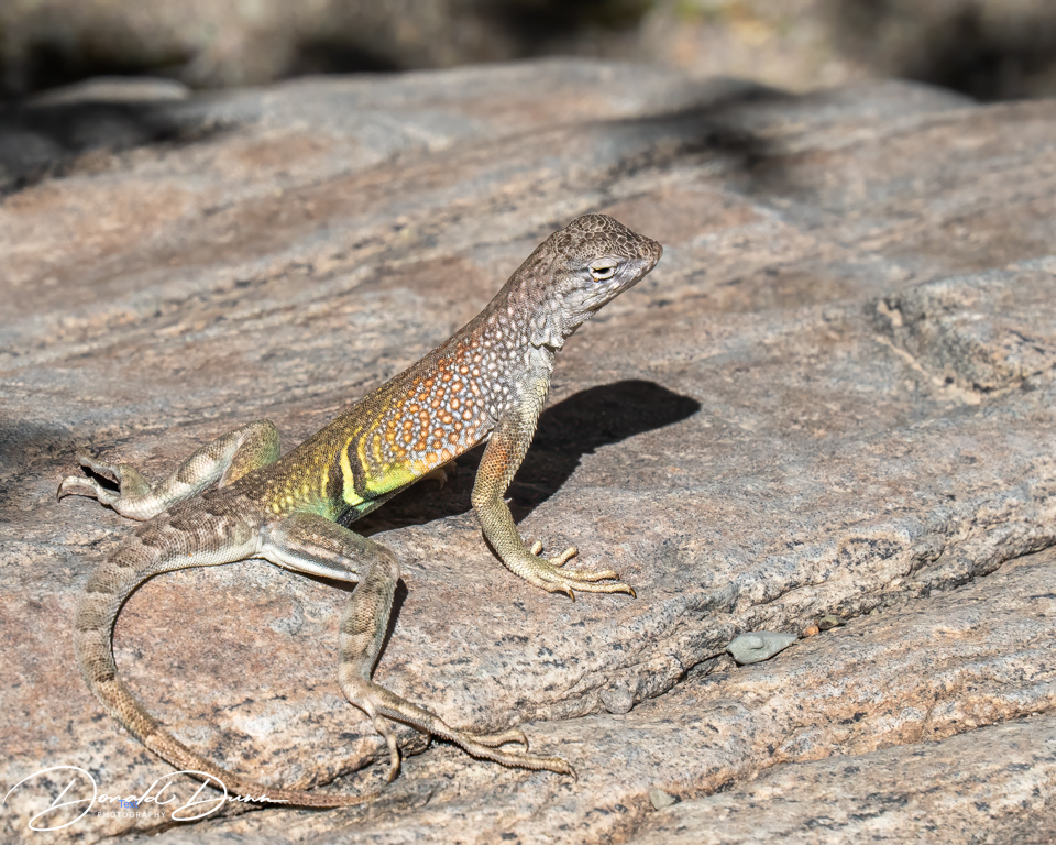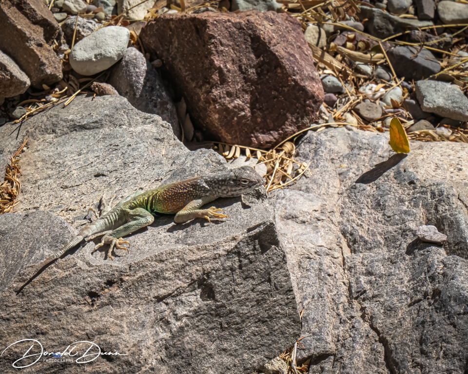 The Lower Burro Mesa Pouroff Trail was a relatively flat, easy hike to a pouroff that is dry most of the year. A good portion of the trail follows a gravel wash lined by Mexican persimmon, Mexican buckeye, and desert hackberry trees. The wash is bounded by volcanic hills with layers of yellow and orange ash-flow tuffs. Large congomerate boulders litter the valley bottom. Along the way were cacti blooms and lizards.