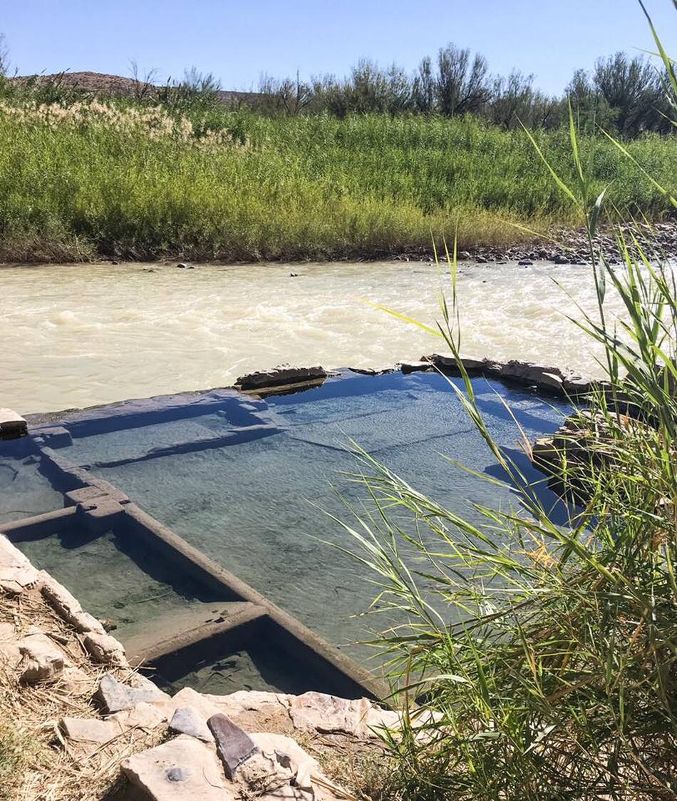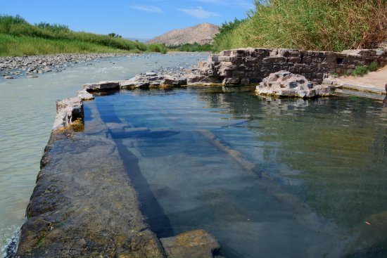 The paved road turns off onto Hot Springs Road, a two-mile gravel road descending down a rough, narrow wash to the Hot Springs Historic District and trailhead area. This road was ROUGH! After parking at the the 0.25 mile trail to the hot spring. The spring is contained by the foundation remains of J.O. Langford’s bathhouse ruins, on the north bank of the Rio Grande The ruins structure could comfortably hold about a dozen people at a time. The water temperature was around 105°. Overflow from the structure fell into the river and the water there was probably in the 80°s. We didn’t take any photos at the spring as it was very crowded and sandy. These photos were borrowed from internet files.