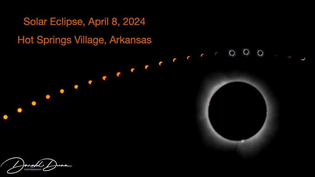 The solar eclipse, also known as the Great North American Eclipse, was a total solar eclipse visible across a band covering parts of North America, from Mexico to Canada and crossing the contiguous United States. A solar eclipse occurs when the Moon passes between Earth and the Sun, thereby obscuring the Sun. A total solar eclipse occurs when the Moon’s apparent diameter is larger than the Sun’s, blocking all direct sunlight. The sky will darken as if it were dawn or dusk. Totality occurs only in a limited path across Earth’s surface, with the partial solar eclipse visible over a larger surrounding region. During this eclipse, the Moon’s apparent diameter was 5.5 percent larger than average. In Hot Springs Village, the partial phase started at 1:32.20 PM. The duration of eclipse totality lasted 3 minutes and 59.1 seconds, starting at 1:59:40 PM, with mid-eclipse occurring at 1:51:36 PM. With a magnitude of 1.0566, the eclipse’s longest duration of totality was 4 minutes and 28.13 seconds just 4 miles north of the Mexican town of Nazas, Durango.
