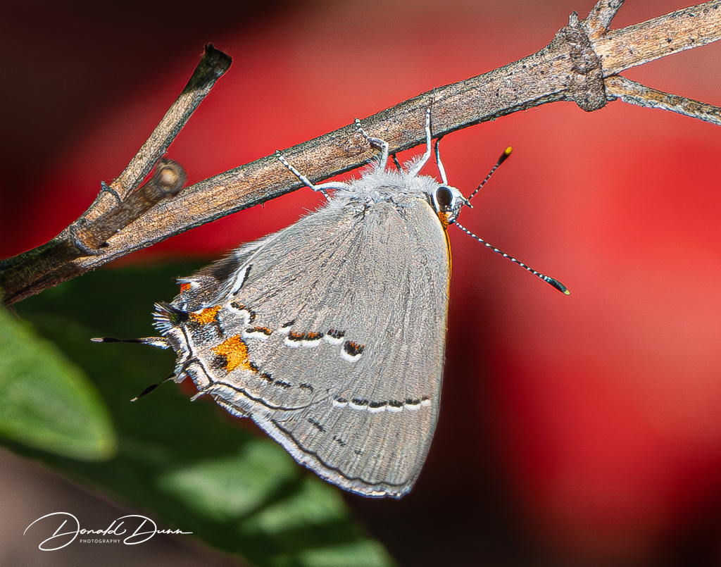 The butterflies are a Red Admiral and Gray Hairstreak, respectively.