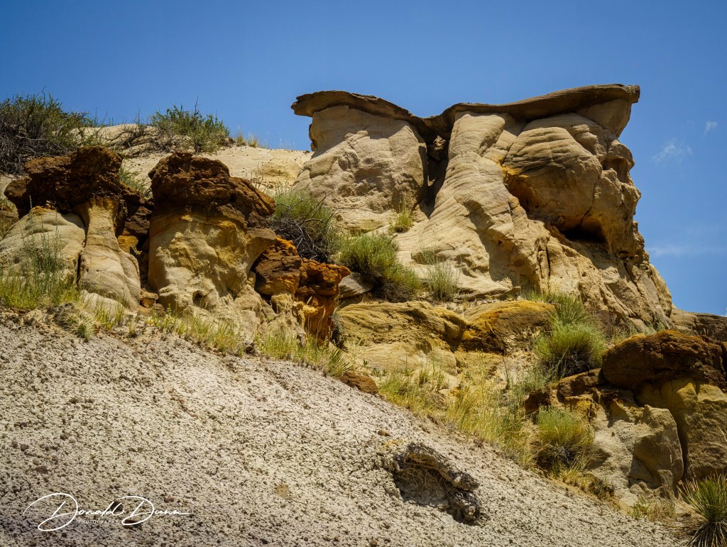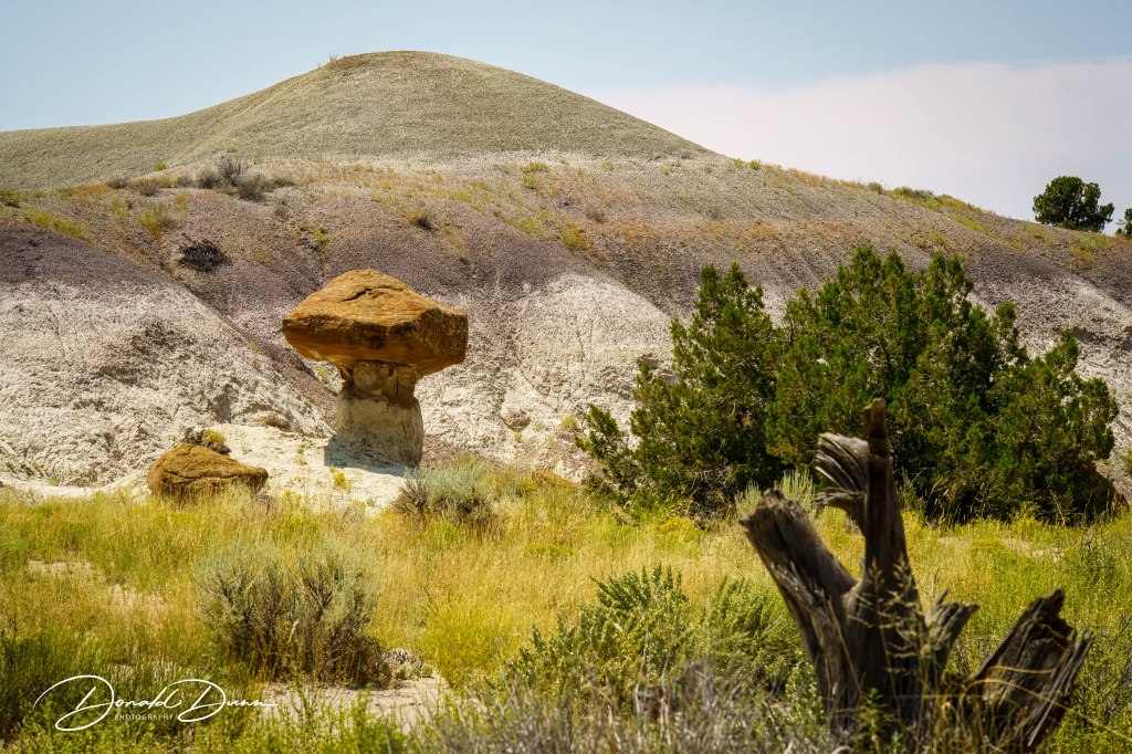 Time and natural elements have etched a fantasy world of strange rock formations made of interbedded sandstone, shale, mudstone, coal, and silt. The weathering of the sandstone forms hoodoos—weathered rock in the form of pinnacles, spires, cap rocks, and other unusual forms. Fossils occur in this sedimentary landform, as well occasional petrified tree elements.