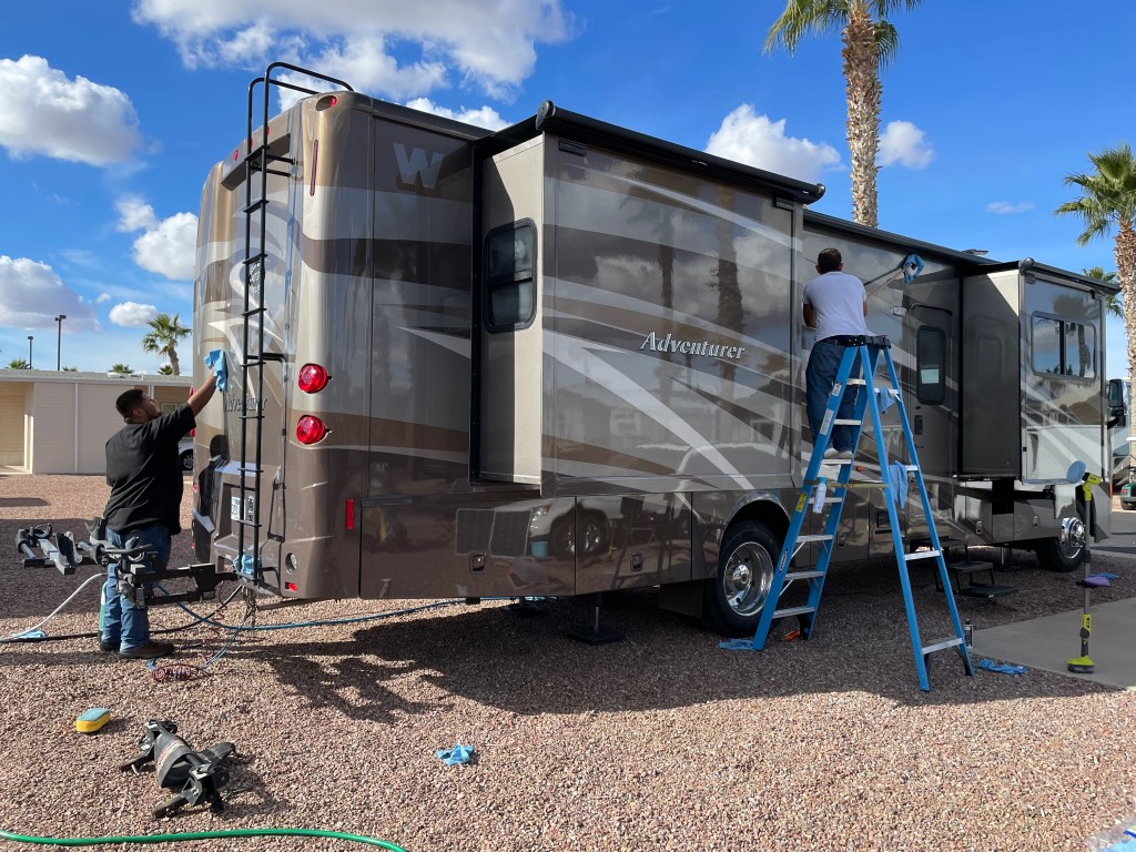 Both the car and motorhome were really dirty after all the miles of travel and dusty roads. Each season we buy unlimited monthly car washes from Clean Freak Car Wash, and for the first month it was only $11; and the car wash has great vacuums and air nozzles! After the car wash, a call was made to have the motorhome washed and waxed. Disappointed with last year’s job, a new “contractor” was hired this year.