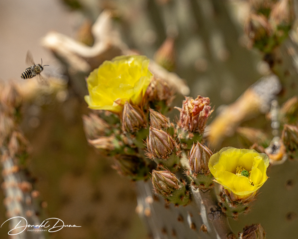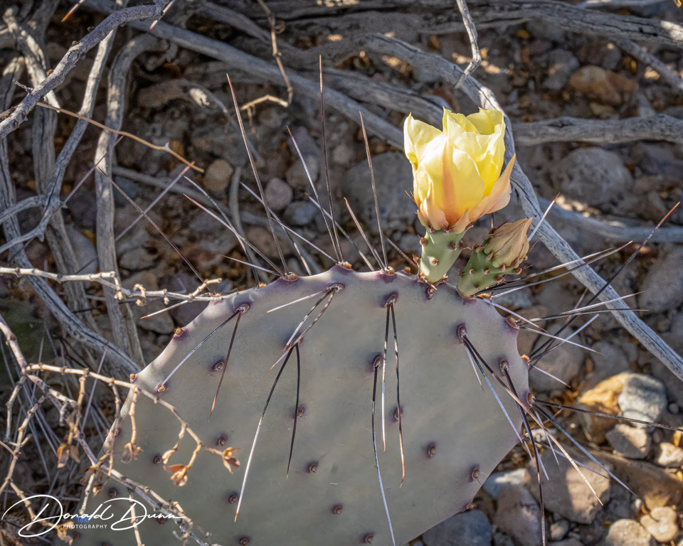 It was on one of the viewing platforms that I almost met my demise. Stepping high to a concrete platform, I tripped and fell, making a three-point landing: both knees and my CAMERA/LENS. While I as bloodied and skinned up, the camera received the brunt of the fall, receiving several deep scratches. Fortunately, it still worked after turning it off and removing and replacing the battery. The bad news is that it now has little resale value! The lens was no worse for wear. Nevertheless, the canyon was photographed and several Cacti were in full bloom. Who knew this spiny plants could offer such pretty flowers.