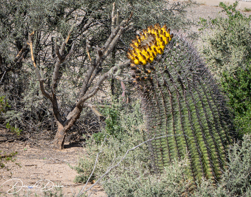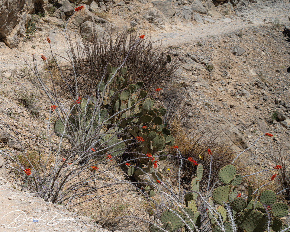 It was on one of the viewing platforms that I almost met my demise. Stepping high to a concrete platform, I tripped and fell, making a three-point landing: both knees and my CAMERA/LENS. While I as bloodied and skinned up, the camera received the brunt of the fall, receiving several deep scratches. Fortunately, it still worked after turning it off and removing and replacing the battery. The bad news is that it now has little resale value! The lens was no worse for wear. Nevertheless, the canyon was photographed and several Cacti were in full bloom. Who knew this spiny plants could offer such pretty flowers.